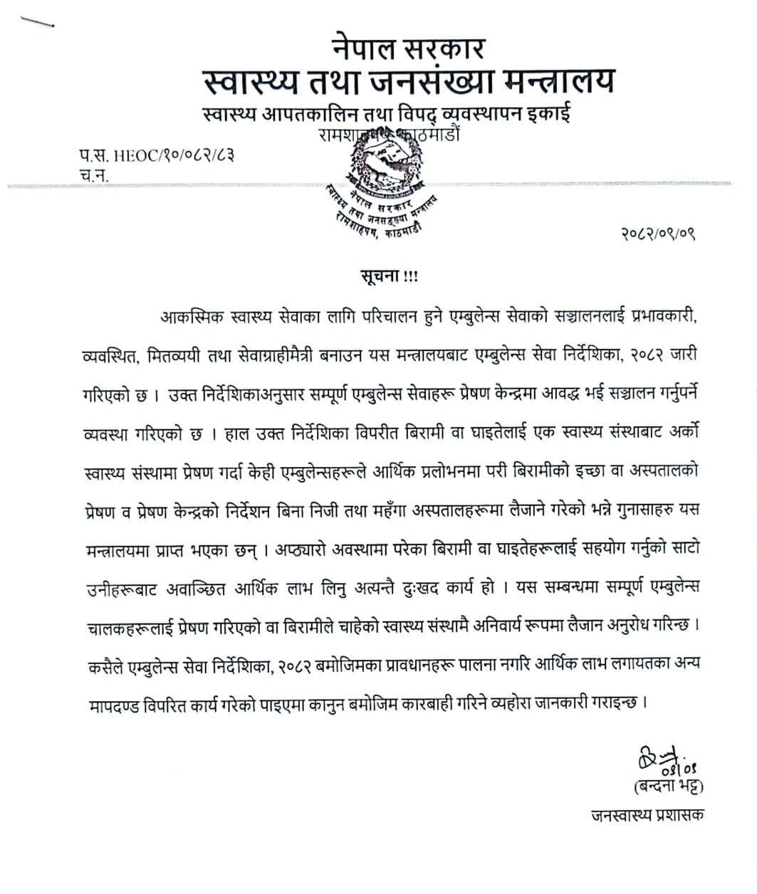 - एम्बुलेन्स चालकले आर्थिक लाभका लागि यस्तो कार्य गरे कारबाही गरिने चेतावनी मन्त्रालयले दिएको छ।