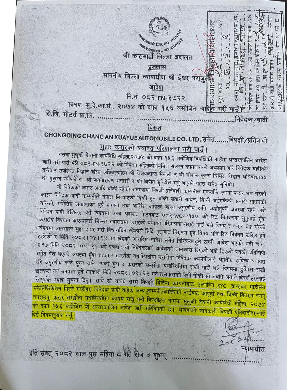 देवानी कार्यविधि संहिता २०७४ को दफा १५६ बमोजिम अन्तरकालीन आदेश जारी गर्दै अदालतले केवाईसी ब्रान्डका गाडीमात्र होइन, उही स्पेसिफिकेसनका गाडी भित्र्याउने र बजारमा बिक्री–वितरण गर्ने कार्य रोक्न निर्देशन दिएको हो ।