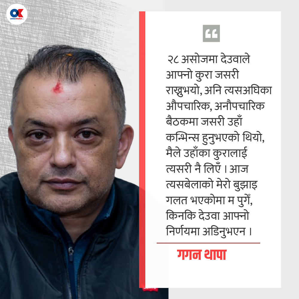 ‘२८ असोजमा देउवाले आफ्नो कुरा जसरी राख्नुभयो, अनि त्यसअघिका औपचारिक, अनौपचारिक बैठकमा जसरी उहाँ कन्भिन्स हुनुभएको थियो, मैले उहाँका कुरालाई त्यसरी नै लिएँ,’ थापाले अनलाइनखबरसँग भने, ‘आज त्यसबेलाको मेरो बुझाइ गलत भएकोमा म पुगेँ, किनकि देउवा आफ्नो निर्णयमा अडिनुभएन ।’