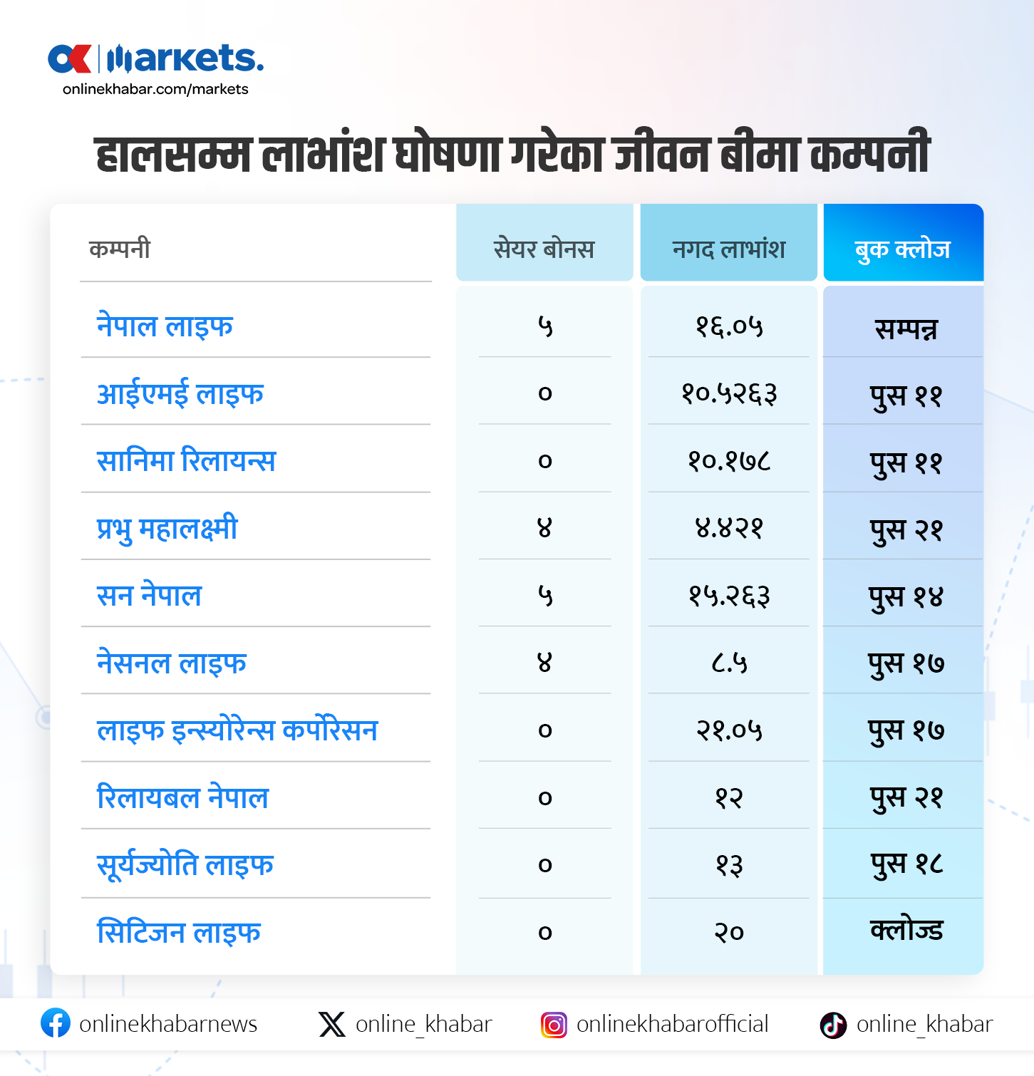 Generated by OK AI. Editorially reviewed.- ९ जीवन बीमा कम्पनीले गत आर्थिक वर्षसम्मको सञ्चित नाफाबाट लाभांश घोषणा गरेका छन्।