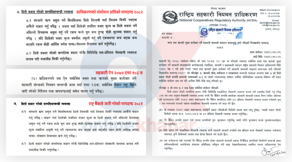 नेपाल राष्ट्र बैंकले सहकारी ऐन २०७४ अनुसार बचत तथा ऋण सहकारीलाई जारी गरेको मापदण्ड अनुसार कर्जा नउठेपछि संस्थाले सकार गरेको धितोमा शतप्रतिशत कर्जा नोक्सानी गर्नु पर्ने व्यवस्था गरेको छ । प्राधिकरणले सोही मापदण्डलाई आधार बनाई सबै बचत तथा ऋण सहकारी संस्थाका लागि नियामकीय मापदण्ड बनाएर २०८२ जेठमा लागू गरेको थियो ।