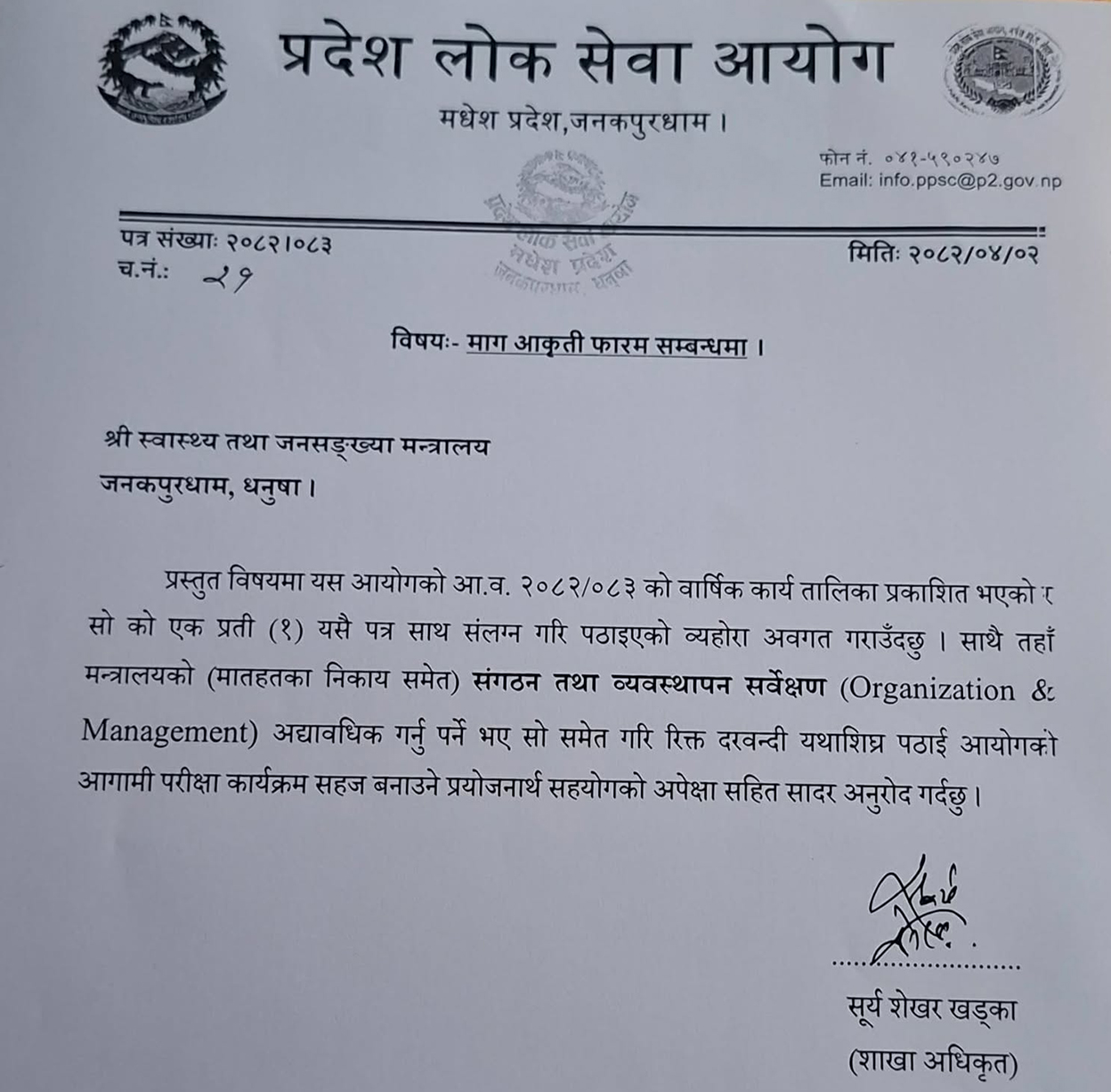लोकसेवा आयोगका अध्यक्ष शिवराम यादवका अनुसार पछिल्ला तीन वर्षयता मधेश प्रदेश सरकारबाट स्वास्थ्य सेवाको पदपूर्तिका लागि माग आकृति फाराम नै प्राप्त भएको छैन ।