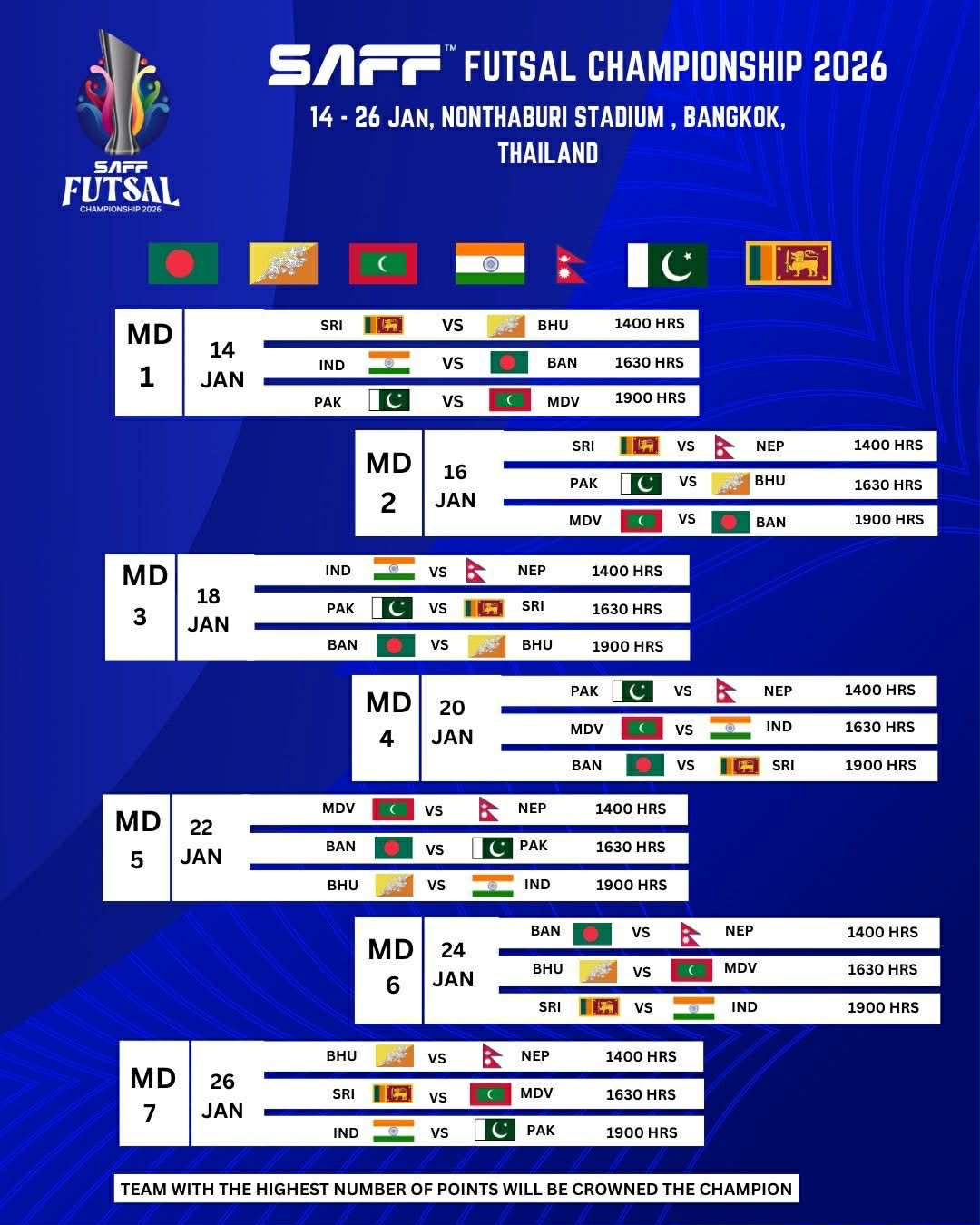 आउँदो जनवरी १३ देखि हुने प्रतियोगिताका लागि साफले जारी गरेको खेलतालिका अनुसार नेपाली पुरुष टिमले १६ जनवरीमा श्रीलंकासँग खेल्नेछ । महिला टिमले १३ जनवरीमा श्रीलंकासँगै खेल्नेछ ।