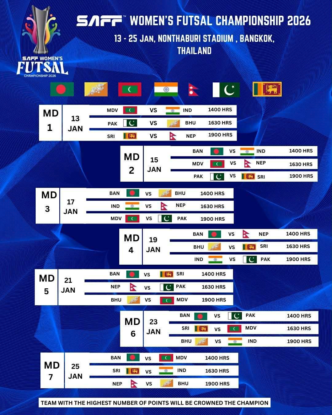 महिलातर्फ १५ जनवरीमा माल्दिभ्स, १७ जनवरीमा भारत, १९ जनवरीमा बंगलादेश, २१ जनवरीमा पाकिस्तान तथा २५ जनवरीमा भुटानसँग खेल्नेछ ।