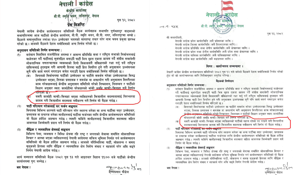 कारबाही फुकुवाबारे कांग्रेसको निर्णय एउटा, पत्राचार अर्कै