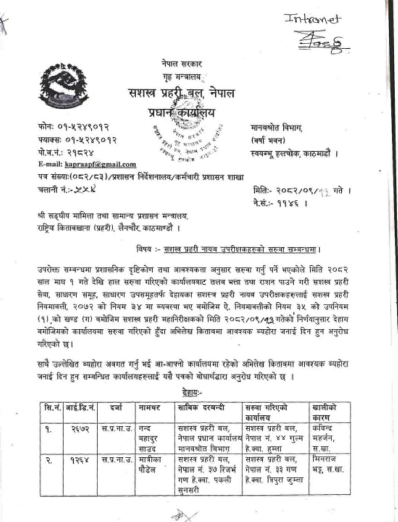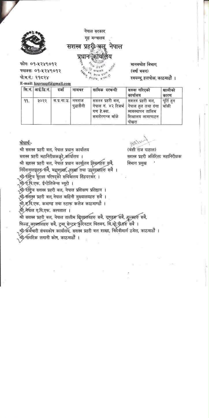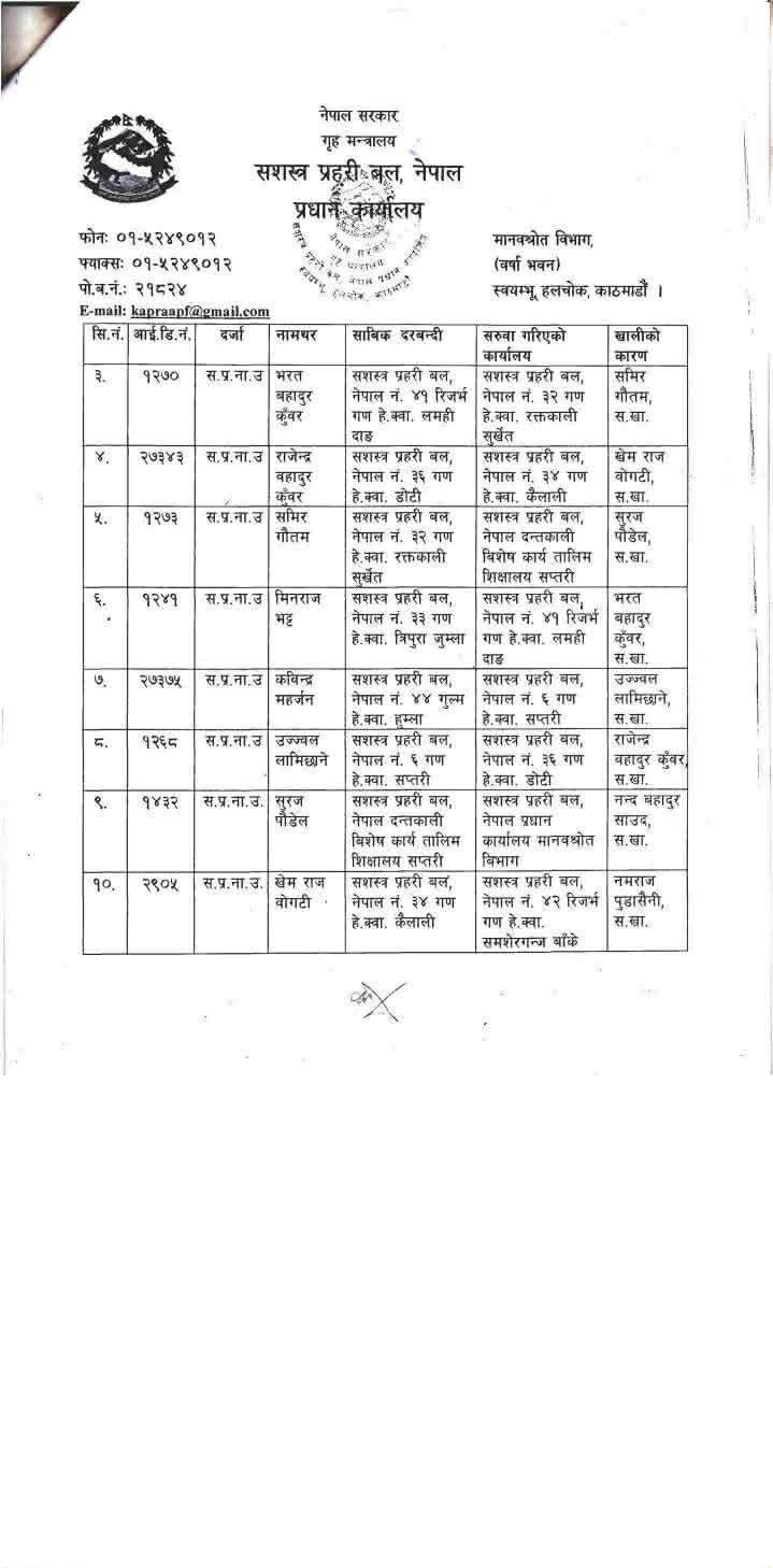 - सरुवा सशस्त्र प्रहरी नियमावली २०७२ को नियम ३४ अनुसार गरिएको सशस्त्र प्रहरीले जनाएको छ।