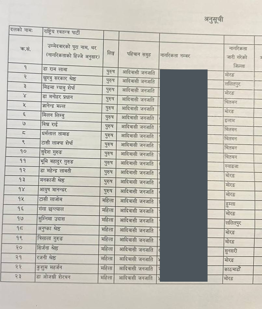 १५ पुस, काठमाडौं । राष्ट्रिय स्वतन्त्र पार्टी (रास्वपा)ले निर्वाचन आयोगको बुझाएको समानुपातिक उम्मेदवारको बन्दसूचीमा कलाकार प्रकाश सपुतदेखि क्रिकेटर ज्ञानेन्द्र मल्लसम्म समावेश छन् ।