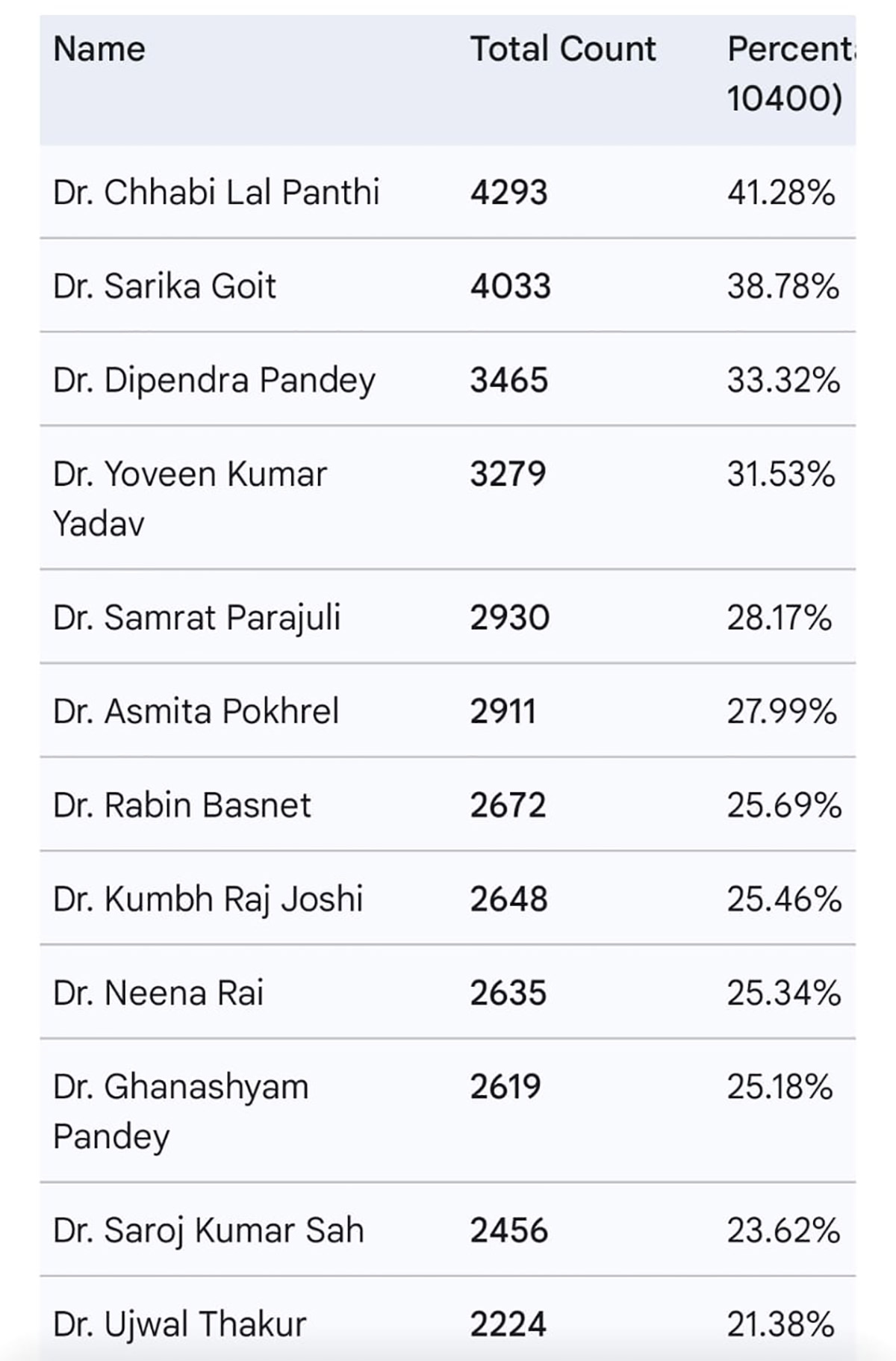 ८ जना सदस्यका लागि भएको निर्वाचनमा डा.छविलाल पन्थी सबैभन्दा अगाडि छन् । उनलले ४२९३ मत पाएका छन् । उनलाई डा.सारिका गोइतले ४०३३ मतसहित पछ्याइरहेकी छिन् ।