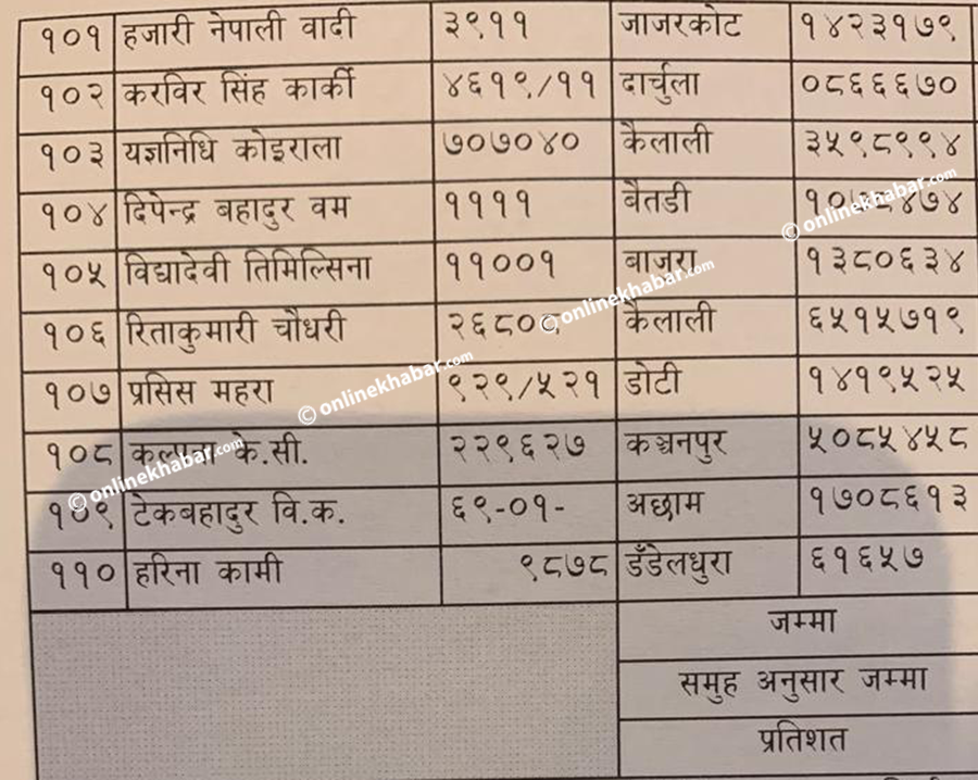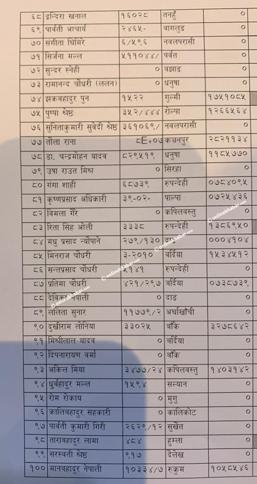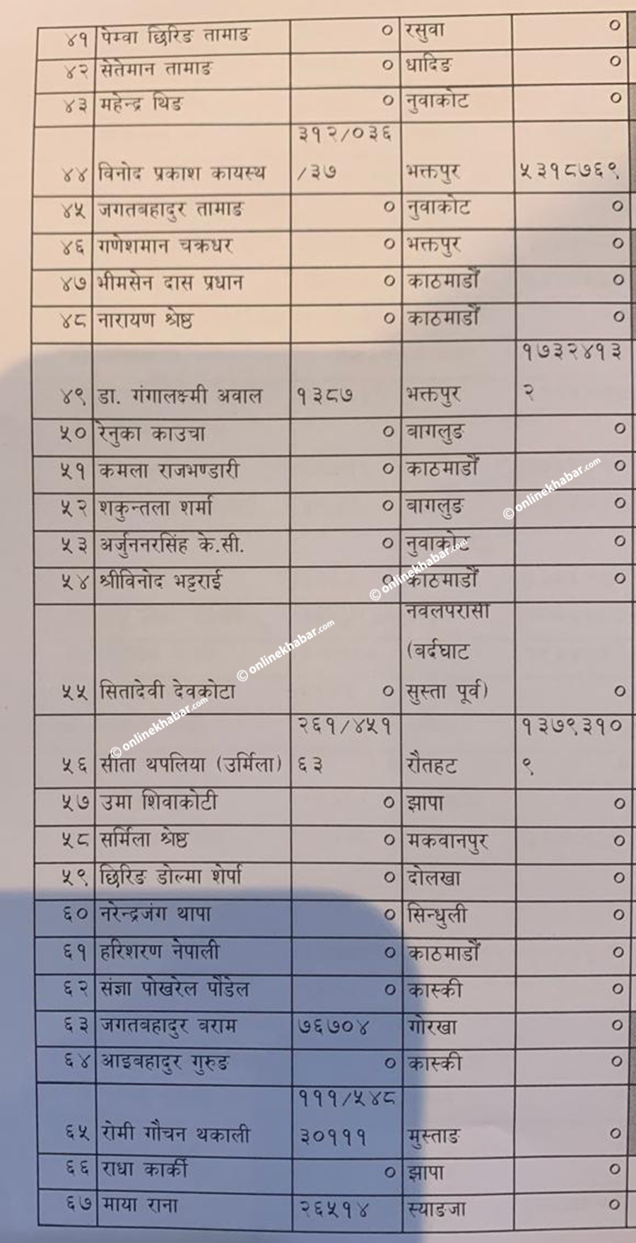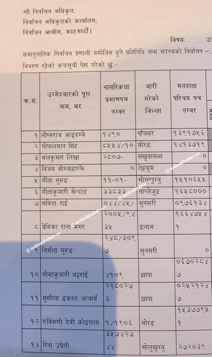 कांग्रेसले केन्द्रीय सदस्य बलबहादुर केसीकी श्रीमती रिना उप्रेतीलाई पनि समाुनपातिकतर्फको उम्मेदवार बनाएको छ । बन्दसूचीमा नेपाल तरुण दलका पूर्वअध्यक्ष विनोदप्रकाश कायस्थको नाम पनि समावेश छ ।