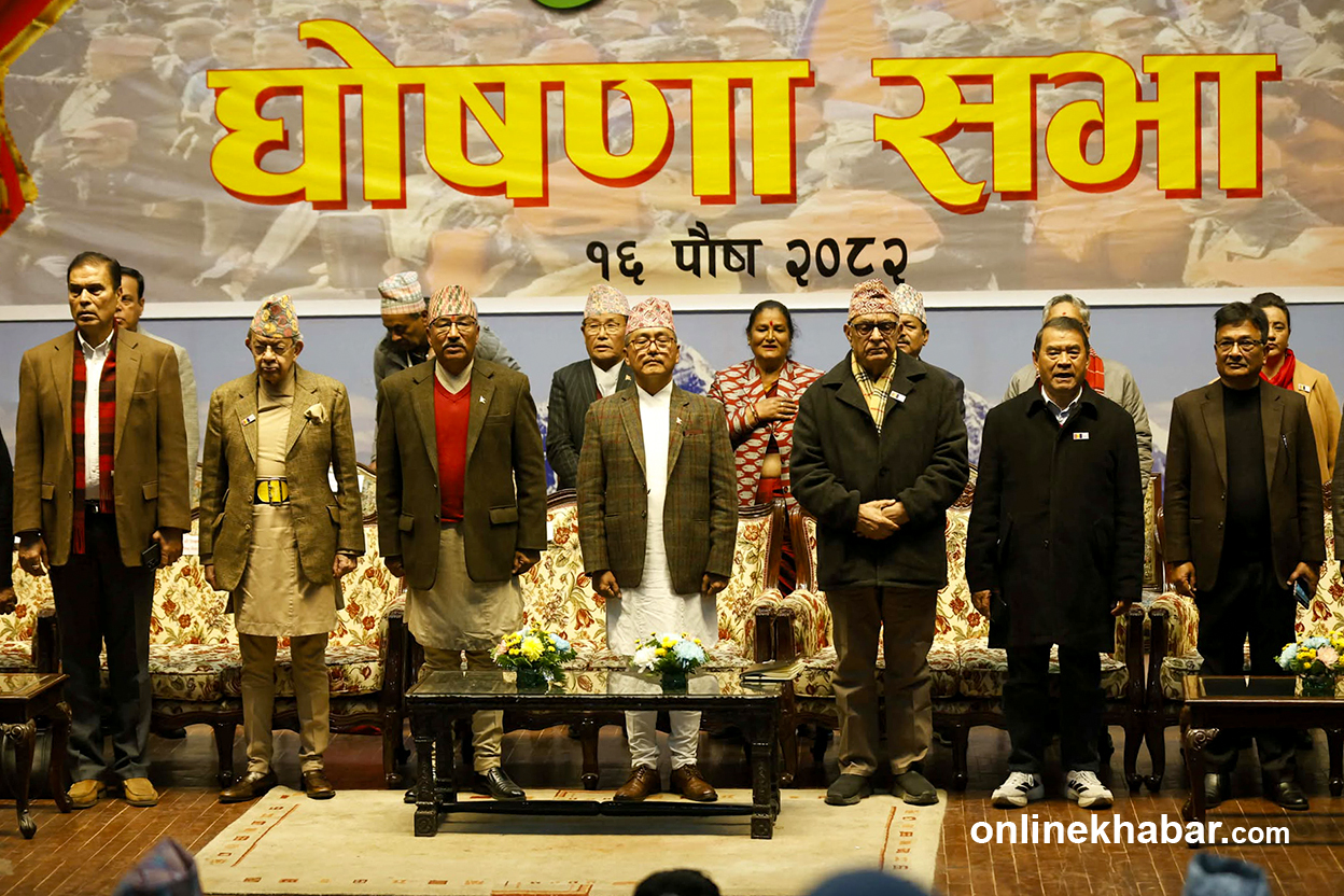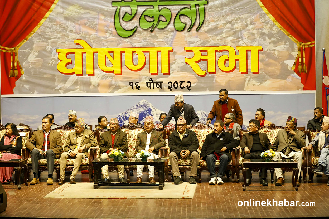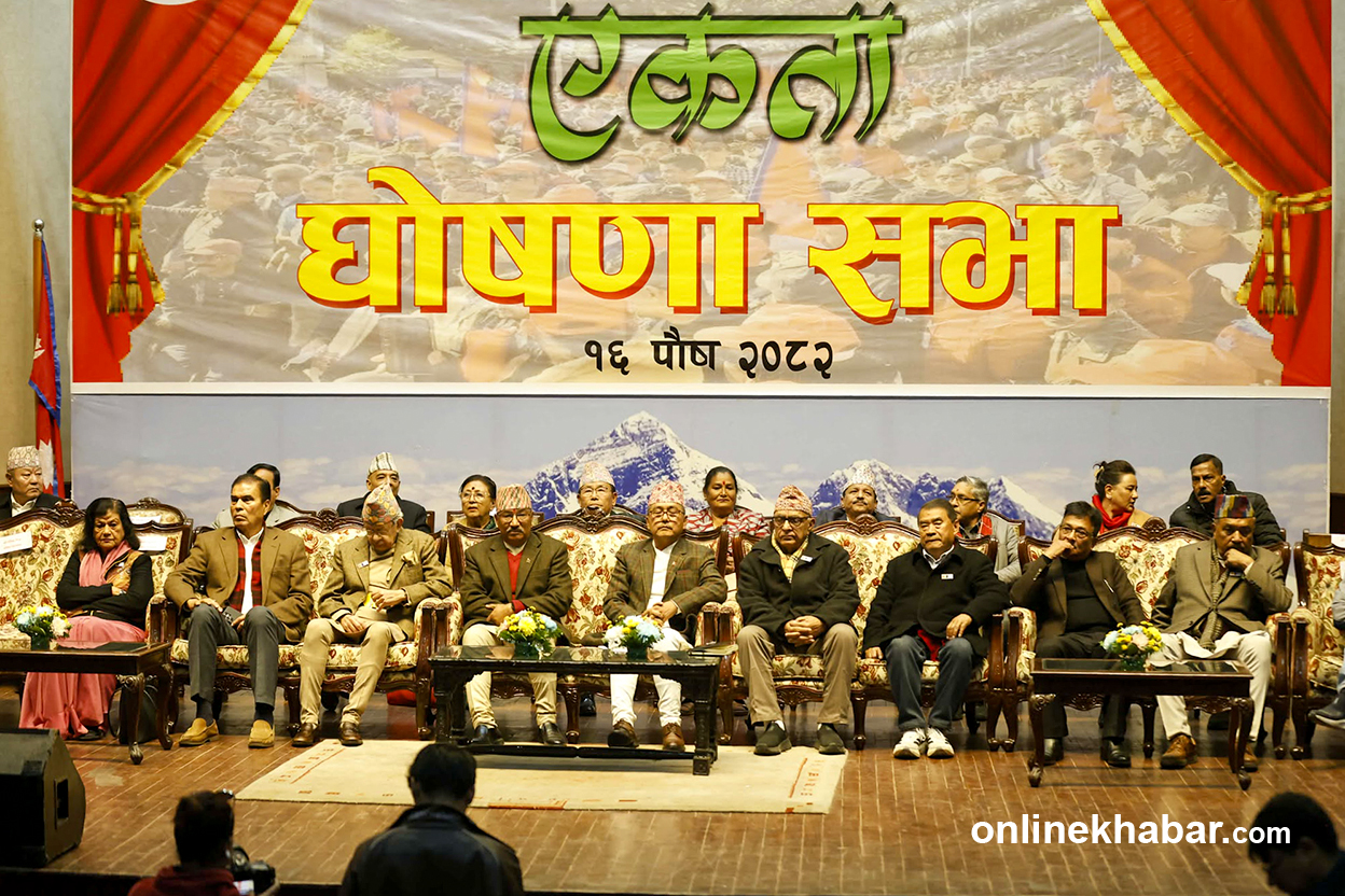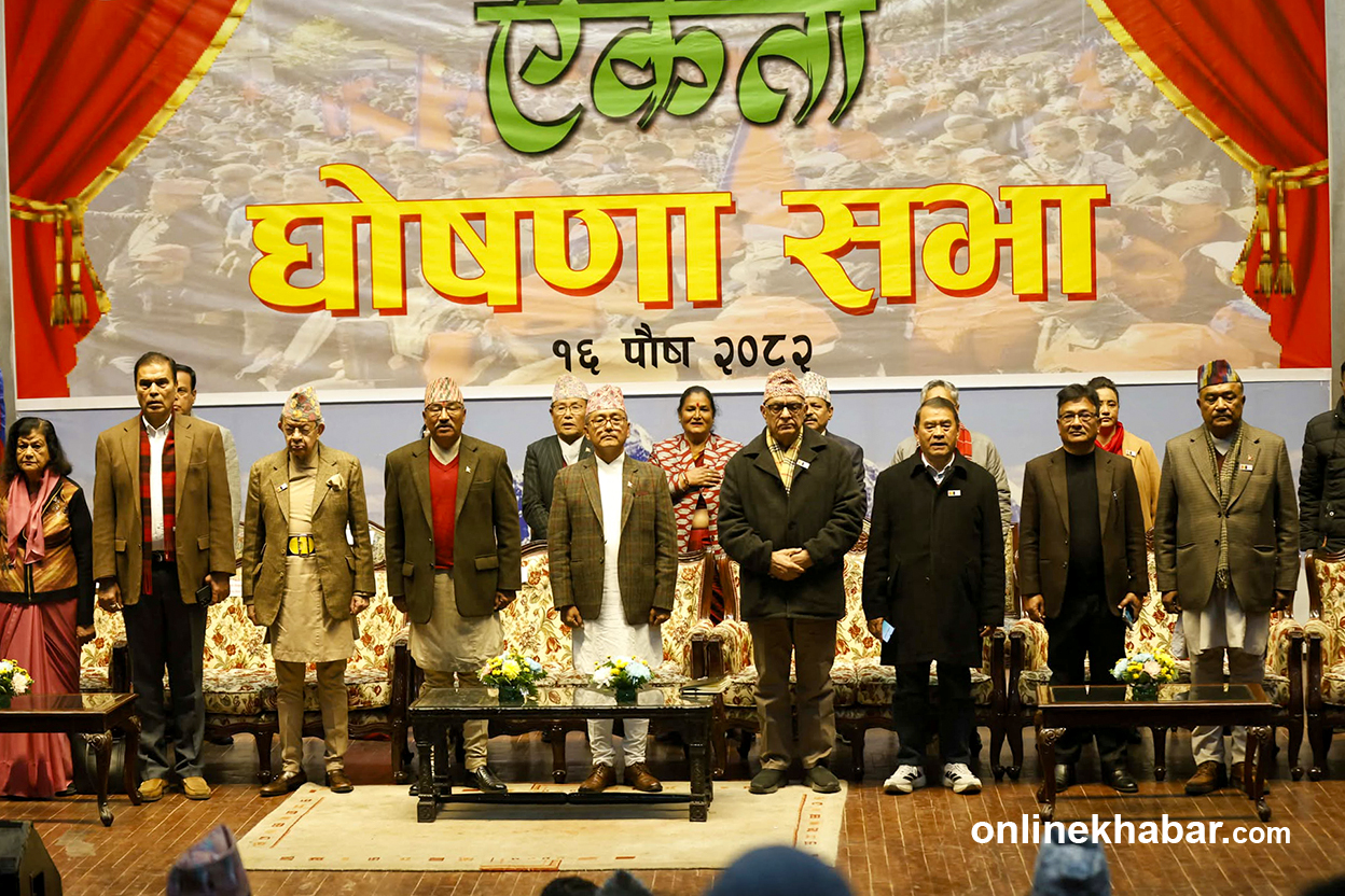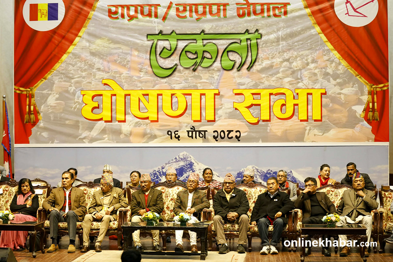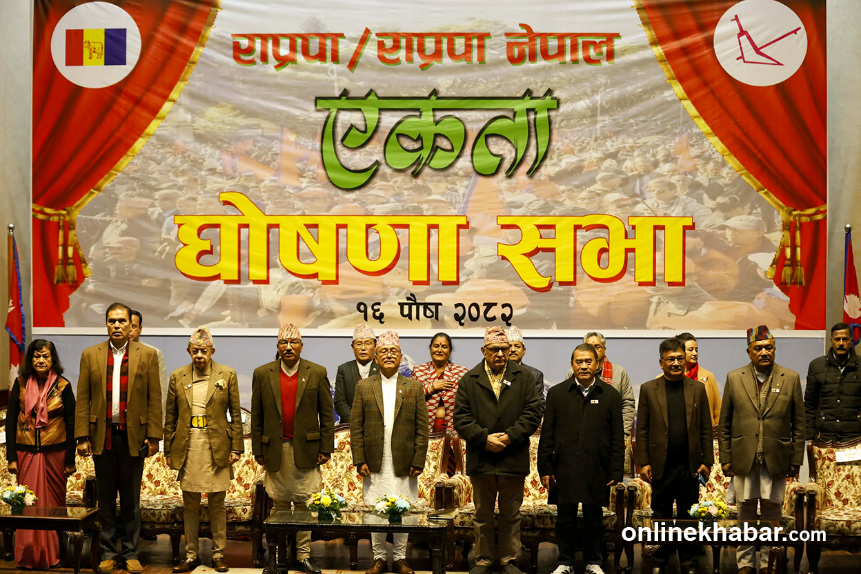 १६ पुस, काठमाडौं । राजेन्द्र लिङ्देन नेतृत्वको राप्रपा र कमल थापा नेतृत्वबीचको एकता घोषणासभा आयोजना गरिएको छ । यसअघि लिङ्देन र थापाले गत ९ पुसमा एकता घोषणा गर्दै सहमतिपत्रमा हस्ताक्षर गरेका थिए । बुधबार काठमाडौंमा एक कार्यक्रम आयोजना गर्दै एकता घोषणा भइरहेको छ ।
