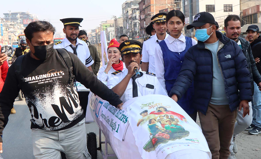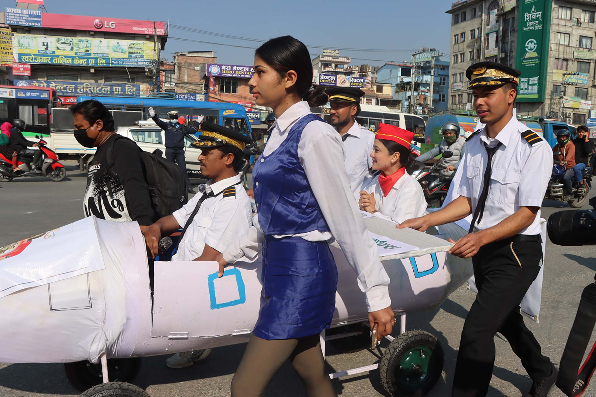 - अभिनेत्री पूजन घिमिरे पाइलट र एअर-होस्टेसको पोशाकमा प्रचार अभियानमा सहभागी भएकी छिन् र सर्वसाधारणसँग प्रत्यक्ष भेटघाट गरिरहेकी छिन्।