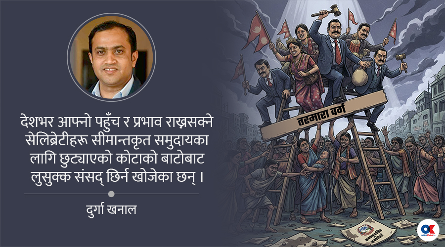 जनताबाट प्रत्यक्ष अनुमोदन नलिई सांसद बन्ने महत्वाकांक्षा अहिले सर्वत्र जागेको छ । त्यसको उदाहरण अहिले समानुपातिक सूचीमा बसेका सेलिब्रिटीहरू नै हुन् । देशभर आफ्नो पहुँच र प्रभाव राख्न सक्ने सेलिब्रिटीहरू वास्तविक सीमान्तकृत समुदायका लागि छुट्याएको कोटाको बाटोबाट लुसुक्क संसद् छिर्न खोजेका छन् । यदि वास्तवमा उनीहरू जनताको प्रतिनिधिको रूपमा अनुमोदित भएर आउने हो भने समानुपातिक सूचीमा नबसी प्रत्यक्ष चुनाव लड्ने आँट देखाउनुपर्ने थियो ।