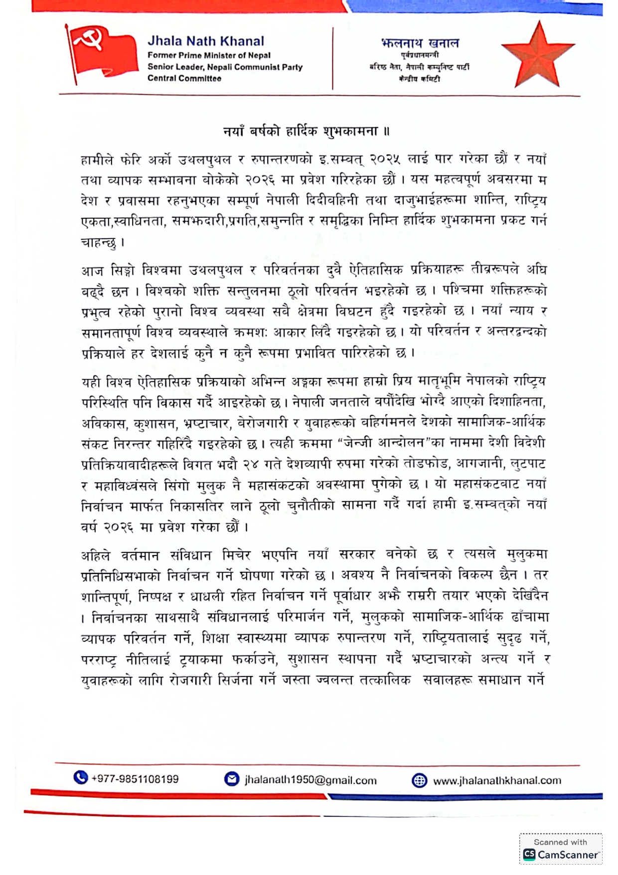 नयाँ वर्ष २०२६ लाई एकता, परिवर्तन, सुदृढीकरण र रूपान्तरणको वर्ष बनाउन सबै देशभक्त र लोकतान्त्रिक शक्तिहरू एकजुट हुनुपर्ने खनालको आह्वान छ ।