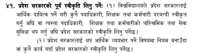 दीर्घकालीन भार पर्ने निर्णय गर्दा विश्वविद्यालयलयले सरकारको पूर्वस्वीकृति लिनुपर्ने २०७६ मा बनेको ऐनको दफा ४१ ले व्यवस्था गरेको छ । ऐनको दफा ४१ को उपदफा १ मा कुनै पनि पदाधिकारी, शिक्षक तथा कर्मचारी दरबन्दी स्वीकृत गर्नुअघि वा त्यस्ता पदाधिकारी, शिक्षक तथा कर्मचारीको पारिश्रमिक तथा सेवा सुविधा थप गर्नुअघि प्रदेश सरकारको स्वीकृत लिनुपर्ने उल्लेख छ । त्यसैको उपदफा २ मा प्रदेश सरकारलाई थप आर्थिक व्यवभार पर्ने नियम बनाउँदा वा कुनै पनि कार्य गर्दा प्रदेश सरकारको स्वीकृती लिनुपर्ने व्यवस्था गरिएको छ ।