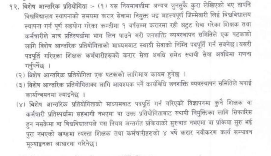 जुन नियमालीको नियम १२ मा विश्वविद्यालय स्थापनाको समयमा करार सेवामा नियुक्त भई महत्वपूर्ण जिम्मेवारी लिई सहयोग गरेका, कम्तीमा १ वर्षसम्म करारमा रही अटुट सेवा गरेका शिक्षक–कर्मचारीले मात्र प्रतिस्पर्धामा भाग लिन पाउने व्यवस्था गरिएको छ । जसका लागि जनशक्ति व्यवस्थापन समितिले एक पटकका लागि विशेष आन्तरिक प्रतियोगिताको माध्यमबाट स्थायी सेवाको निम्ति पदपूर्ति गर्नसक्ने नियम राखेको छ ।