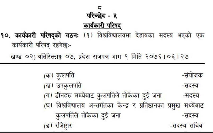 पछिल्लो नियमावलीले उपकुलपतिको अध्यक्षतामा ३ सदस्यीय समिति बनाइएको भए पनि नोटमा कार्यकारी परिषद्ले आवश्यक ठानेको खण्डमा स्थायी आमन्त्रित सदस्य व्यवस्था गर्न सकिने उल्लेख गरिएको छ । जुन नियम ऐनसँग पनि बाझिएको छ ।