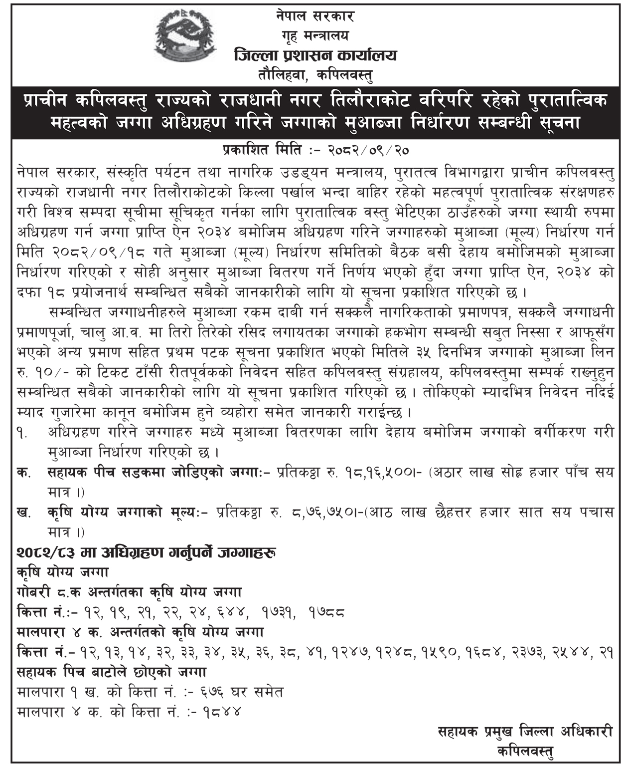 जिल्ला प्रशासन कार्यालय कपिलवस्तुका अनुसार जग्गा प्राप्ति ऐन, २०३४ बमोजिम गठित मुआब्जा निर्धारण समितिको बैठकले २०८२ साउन १५ गते मुआब्जा दर तोकेको छ । त्यसको जानकारी आज सार्वजनिक सूचना प्रकाशित गरेर दिइएको छ ।