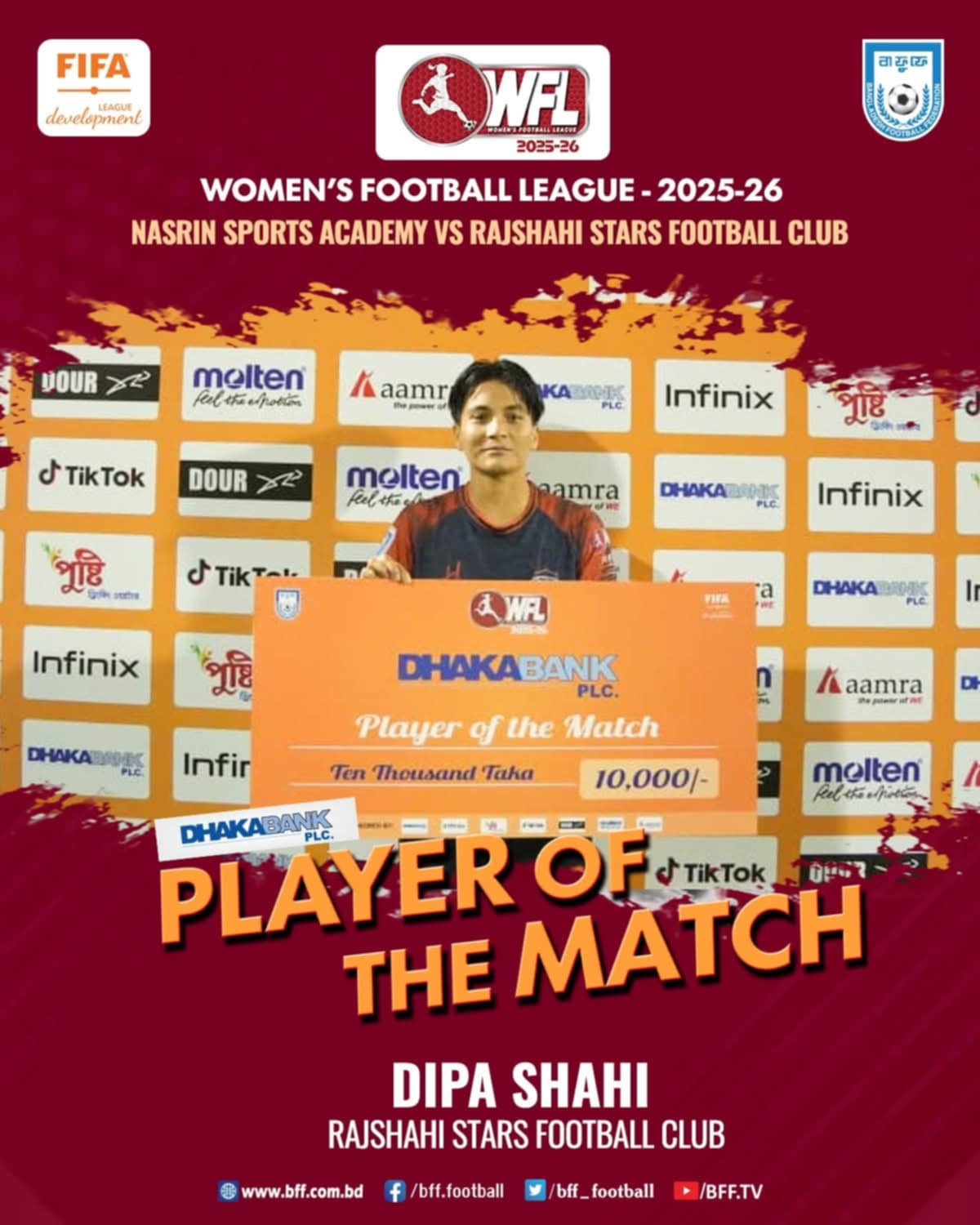 राजशाही स्टार्स एफसीबाट बंगलादेशको महिला फुटबल लिगमा डेब्यू गरेकी दिपाले उत्कृष्ट प्रदर्शन गर्दै नसरिन स्पोर्ट्स एकेडेमी विरुद्ध ४ गोल गरेकी हुन् ।