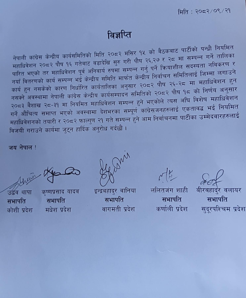 Generated by OK AI. Editorially reviewed.- नेपाली कांग्रेसका पाँच प्रदेश सभापतिहरूले नियमित महाधिवेशनको तयारी र २१ फागुनको निर्वाचनमा उम्मेदवार जिताउन एकताबद्ध हुन आग्रह गरेका छन्।