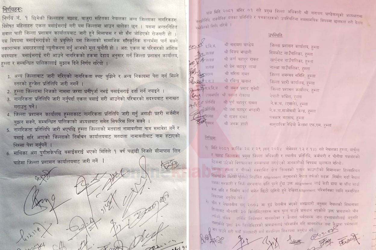 यसैगरी, जिल्ला प्रशासन कार्यालय हुम्लाबाट नागरिकता प्रतिलिपि जारी गर्नु अगाडि प्रहरीले सर्जमिन बुझ्न सक्ने, सम्बन्धित पालिका अध्यक्षबाट सिफारिस लिन सक्ने, नागरिकता प्रतिलिपि जारी भएपछि हुम्लाको मतदाता नामवालीमा समावेश गर्ने र बसाइँ सरी आएको जिल्ला निर्वाचन कार्यालयबाट मतदाता नामावाली समावेश गर्न र सम्पूर्ण प्रक्रिया पुगिसकेपछि बसाइँसराइ गरेको एक वर्षपछि सीमापास लिन सक्ने जिल्ला प्रशासनको निर्णय उल्लेख छ ।