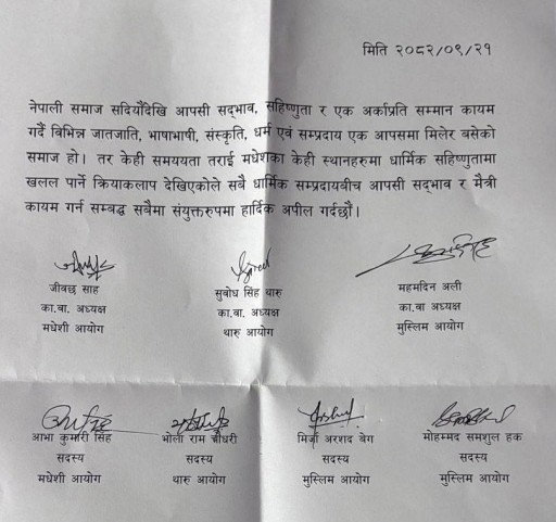 Generated by OK AI. Editorially reviewed.- मधेशका विभिन्न जिल्लामा धार्मिक सम्प्रदायबीच आपसी सद्भाव कायम गर्न सात आयोगले संयुक्त विज्ञप्ति जारी गरेका छन्।