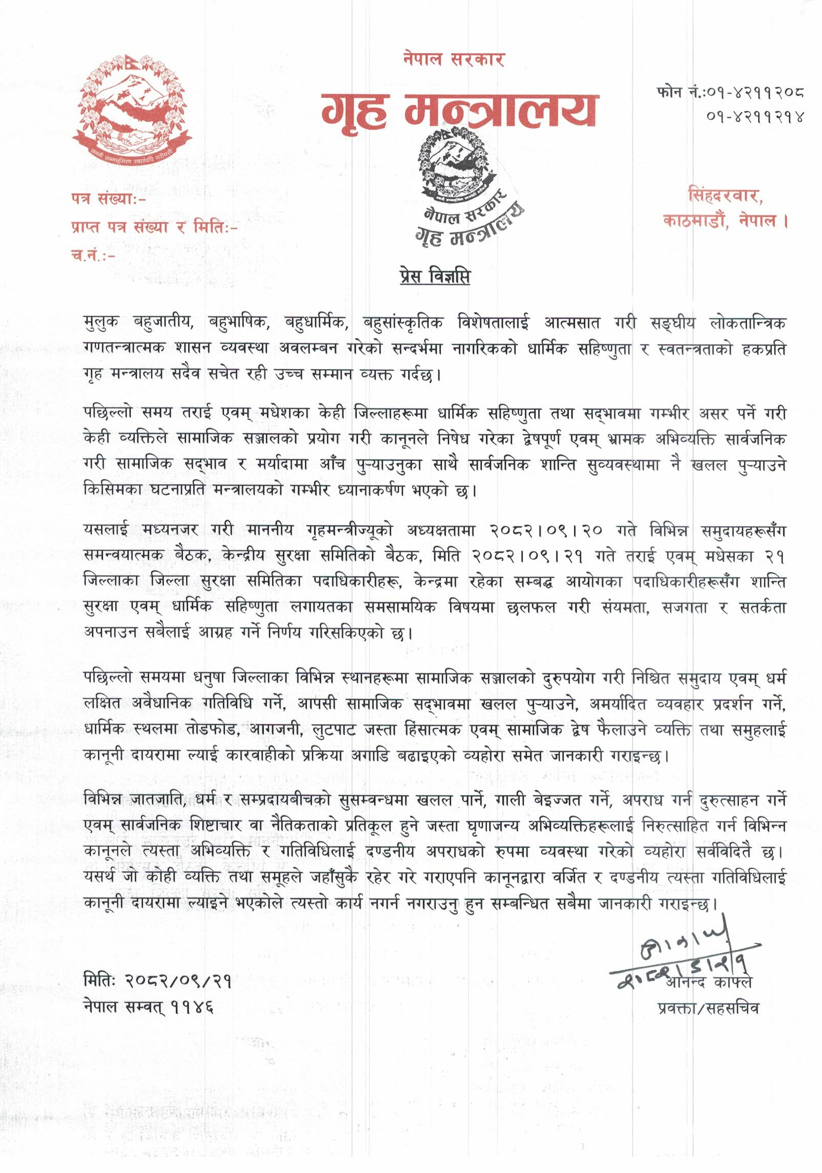 सोमबार एक विज्ञप्ति जारी गर्दै गृह मन्त्रालयले सामाजिक सञ्जालको प्रयोग गरी कानुनले निषेध गरेका द्वेषपूर्ण एवं भ्रामक अभिव्यक्ति सार्वजनिक गरेर शान्ति सुव्यवस्थामा खलल पुर्याउने जो कोहीलाई कारबाही गरिने जनाएको हो ।