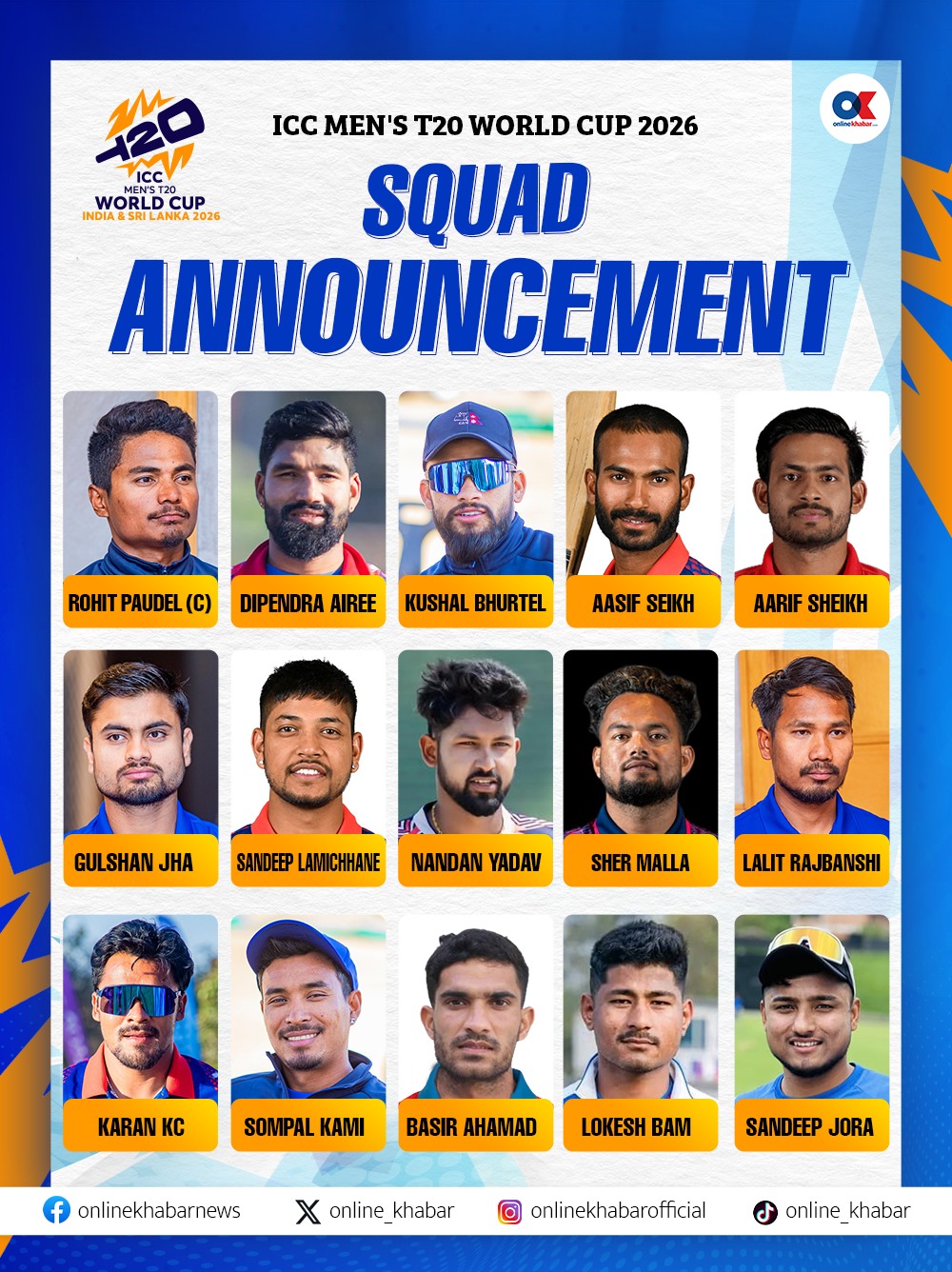 Generated by OK AI. Editorially reviewed.- नेपाल क्रिकेट संघले रोहित पौडेलको कप्तानीमा १५ सदस्यीय टोली आईसीसी टी-२० विश्वकप २०२६ का लागि घोषणा गरेको छ।