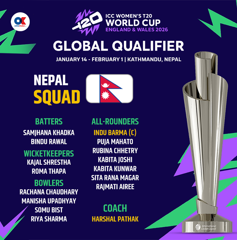 २४ पुस, काठमाडौं । आईसीसी महिला टी-२० विश्वकपको ग्लोबल छनोट आगामी जनवरी १८ देखि नेपालमा सुरु हुँदैछ । घरेलु मैदानमै हुने यस महत्वपूर्ण प्रतियोगिताका लागि नेपाली महिला क्रिकेट टिम यतिबेला तयारीमा व्यस्त छ ।