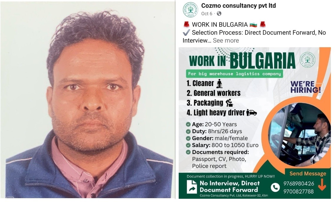 २३ पुस, काठमाडौं । रामेछापका राजेश कार्कीले सामाजिक सञ्जाल फेसबुकमा बुल्गेरियामा रोजगारी अवसरको विज्ञापन देखे । फेसबुकमा प्रचारका लागि राखिएको पोस्टर हेरेर उनले एप्लाई गर्ने सोच बनाए र कोटेश्वरमा रहेको ‘कोज्मो एजुकेसन कन्सल्टेन्सी’ मा सम्पर्क गरे । अफिसमा जाँदासम्म उनलाई सबै कुरा ठिक लागेको थियो ।
