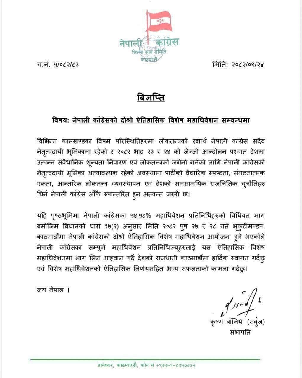 ‘नेपाली कांग्रेसका ५४.५८% महाधिवेशन प्रतिनिधिहरूको विधिवत माग बमोजिम विधानको धारा १७(२) अनुसार मिति २०८२ पुस २७ र २८ गते भृकुटीमण्डपमा दोस्रो ऐतिहासिक विशेष महाधिवेशन आयोजना हुने भएकोले सम्पूर्ण महाधिवेशन प्रतिनिधिलाई यस ऐतिहासिक विशेष महाधिवेशनमा भाग लिन आह्वान गर्दै देशको राजधानी काठमाडौंमा हार्दिक स्वागत गर्दछु एवं विशेष महाधिवेशनको ऐतिहासिक निर्णयसहित भव्य सफलताको कामना गर्दछ’ उनले भनेका छन् ।