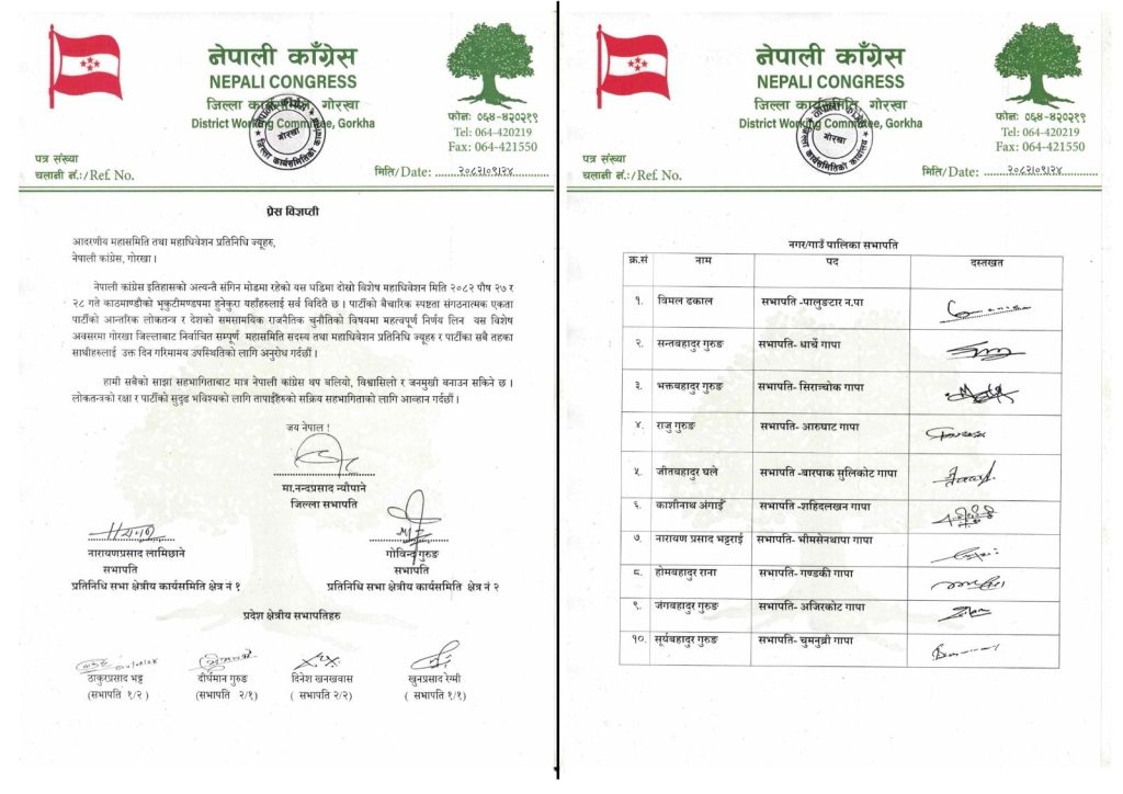 यहाँ जिल्लाको ११ पालिकामध्ये गोरखा नगरपालिकाका सभापति चन्दनबहादुर खत्रीले भने हस्ताक्षर गरेका छैनन् । उनी गण्डकीमा मुख्यमन्त्री सुरेन्द्रराज पाण्डेनिकट मानिन्छन् । पाण्डे पार्टी सभापति शेरबहादुर देउवानिकट हुन् ।