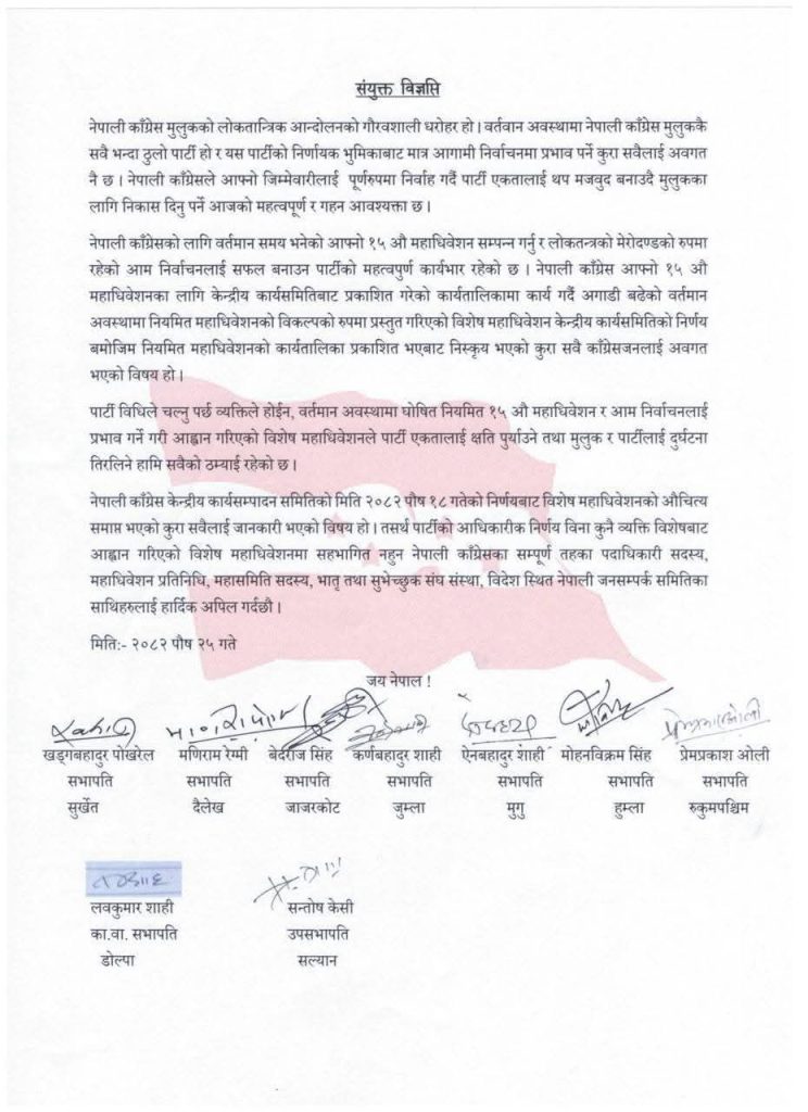‘नेपाली कांग्रेस केन्द्रीय कार्यसम्पादन समितिको पौष १८ गतेको निर्णयबाट विशेष महाधिवेशनको औचित्य समाप्त भएको कुरा सबैलाई जानकारी भएको विषय हो,’ विज्ञप्तिमा भनिएको छ, ‘तसर्थ, पार्टीको आधिकारीक निर्णयबिना कुनै व्यक्ति विशेषबाट आह्वान गरिएको विशेष महाधिवेशनमा सहभागित नहुन नेपाली कांग्रेसका सम्पूर्ण तहका पदाधिकारी सदस्य, महाधिवेशन प्रतिनिधि, महासमिति सदस्य, भ्रातृ तथा शुभेच्छुक संघ संस्था, विदेशस्थित नेपाली जनसम्पर्क समितिका साथीहरूलाई हार्दिक अपिल गर्दछौं,’ संयुक्त विज्ञप्तिमा भनिएको छ ।