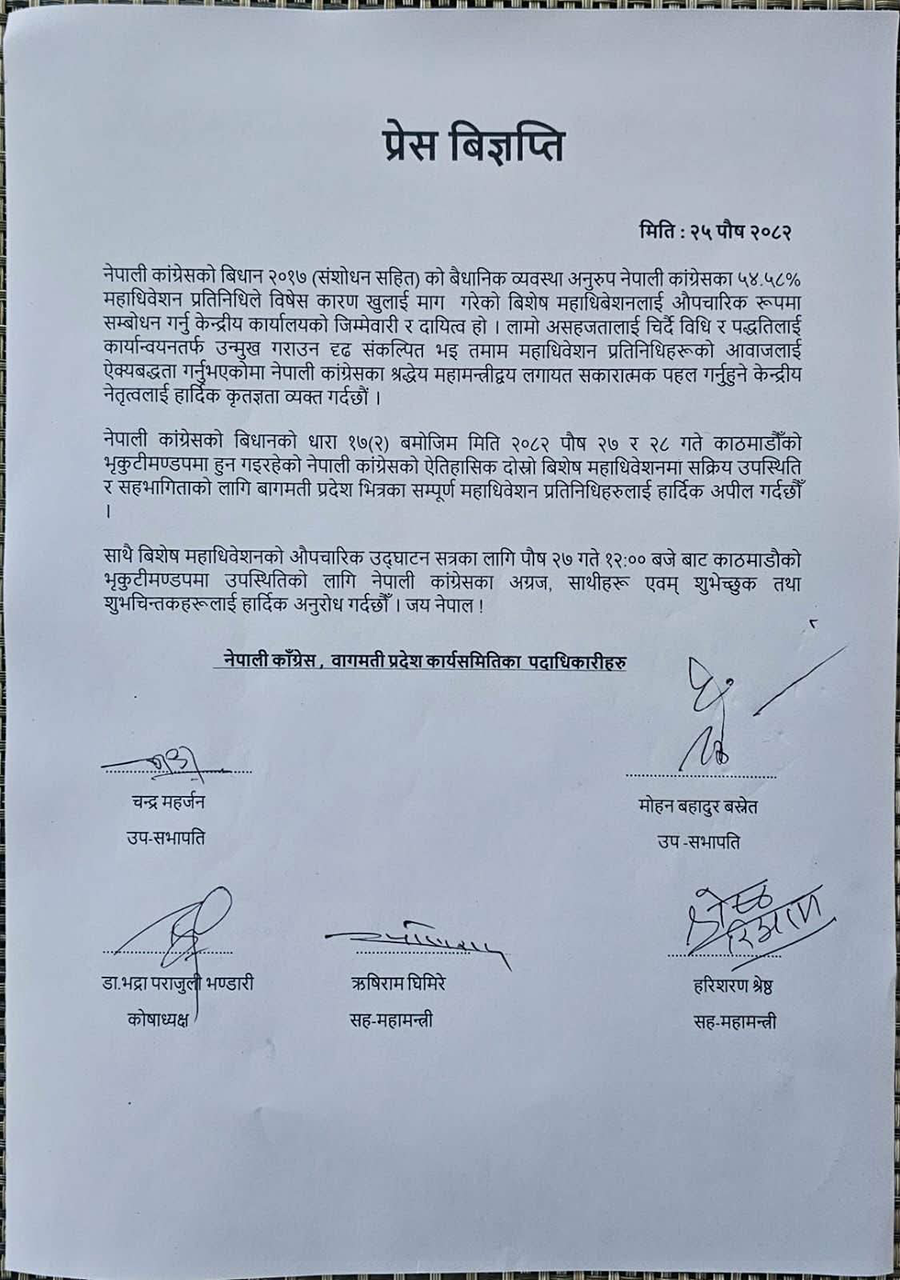 शुक्रबार प्रेस विज्ञप्ति जारी गर्दै उनीहरूले कांग्रेसको विधान (२०१७ संशोधन सहित) को वैधानिक व्यवस्था अनुरूप ५४.५८ प्रतिशत महाधिवेशन प्रतिनिधिले विशेष कारण खुलाइ माग गरेको विशेष महाधिवेशनलाई औपचारिक रूपमा सम्बोधन गर्नु केन्द्रीय कार्यालयको जिम्मेवारी र दायित्व रहेको बताएका छन् ।
