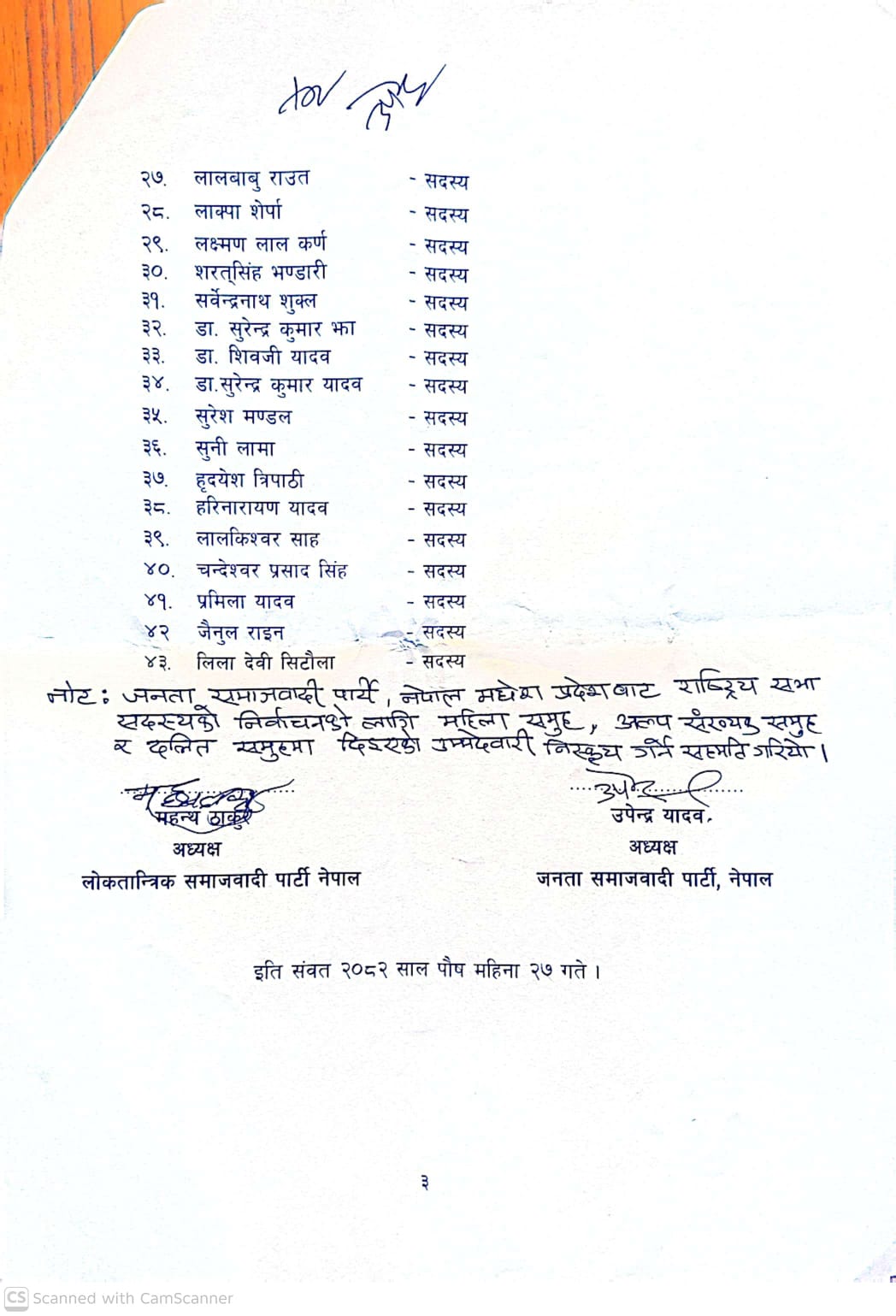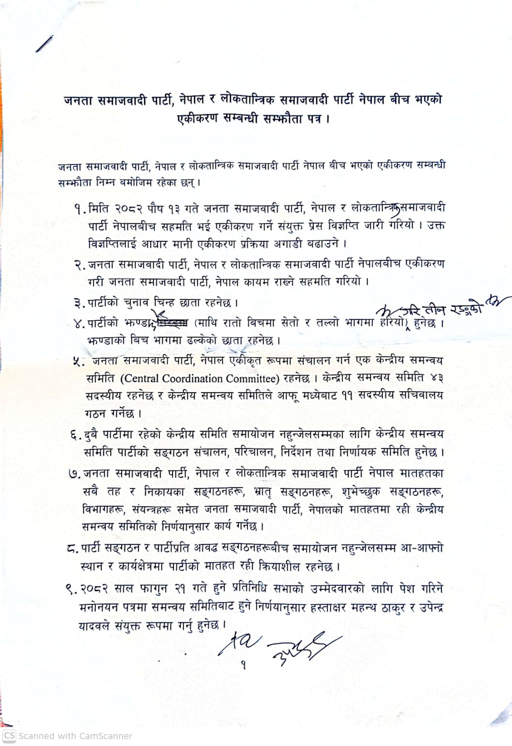२६ पुस, काठमाडौं । जनता समाजवादी पार्टी नेपाल र लोकतान्त्रिक समाजवादी पार्टी (लोसपा) नेपालबीच १२ बुँदे सम्झौता भएको छ । आइतबार यी दुई दलहरूबीच १२ बुँदे सम्झौता भएको हो ।
