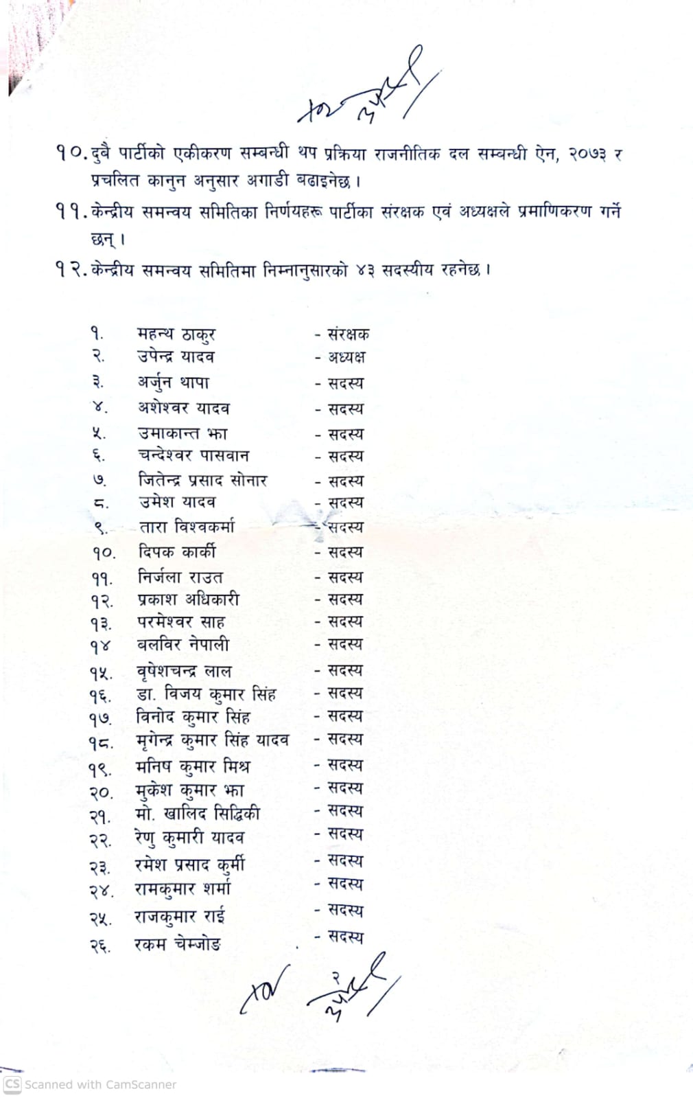 सम्झौता अनुसार, ४३ सदस्यीय केन्द्रीय समन्वय समिति बनाइएको छ । जसमा महन्थ ठाकुरलाई संरक्षक बनाइएको छ भने अध्यक्षमा उपेन्द्र यादव चयन भएका छन् ।