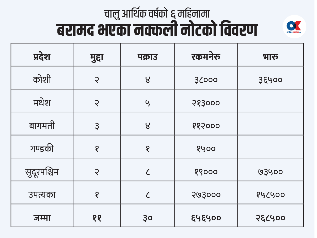 जसअनुसार कोशी प्रदेशमा यो ६ महिनाको अवधिमा नक्कली नोटसम्बन्धी २ वटा मुद्दा दायर भएका छन् । जसमा ४ जना पक्राउ पर्नुका साथै ३८ हजार नेपाली नक्कली रुपैयाँ र ३६ हजार ५०० नक्कली भारु बरामद भएका छन् ।