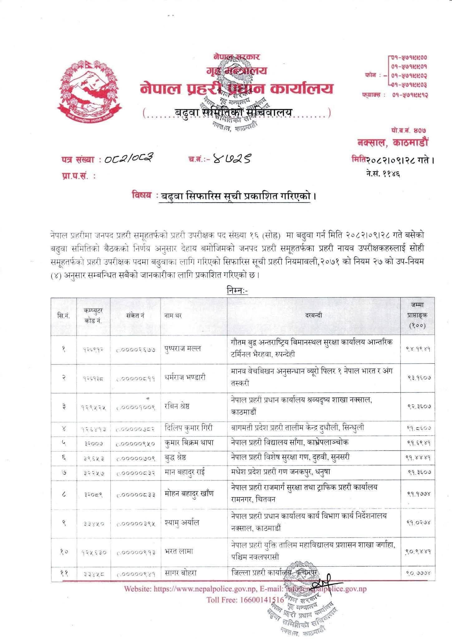 प्रहरी प्रधान कार्यालयका अनुसार पहिलो नम्बरमा डीएसपी पुष्पराज मल्ल सिफारिस भएका छन् । त्यस्तै धर्मराज भण्डारी, रबिन श्रेष्ठ, दीलिपकुमार गिरी, कुमार विक्रम थापा, बुद्ध श्रेष्ठ, मानबहादुर राई, मोहनबहादुर खाण, श्यामु अर्याल, भरत लामा, सागर बोहरा, रामकुमार दानी, छेदीलाल कामती, हरिबहादुर ओली, प्रदीपकुमार सिंह र दिपक भारतीलाई एसपीमा बढुवा गर्न सिफारिस गरिएको छ ।