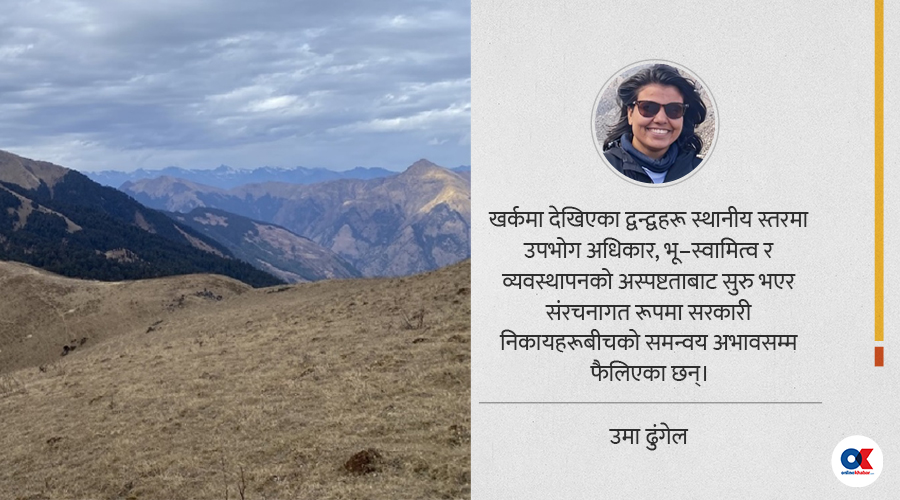 यसरी, खर्कको भू–स्वामित्वसम्बन्धी द्वन्द्व केवल जमिनको सिमानासँग मात्र सम्बन्धित नभई पहिचान, परम्परा, जीविकोपार्जन र अधिकारसँग गहिरो रूपमा गाँसिएको सामाजिक–राजनीतिक मुद्दा बनेको छ।