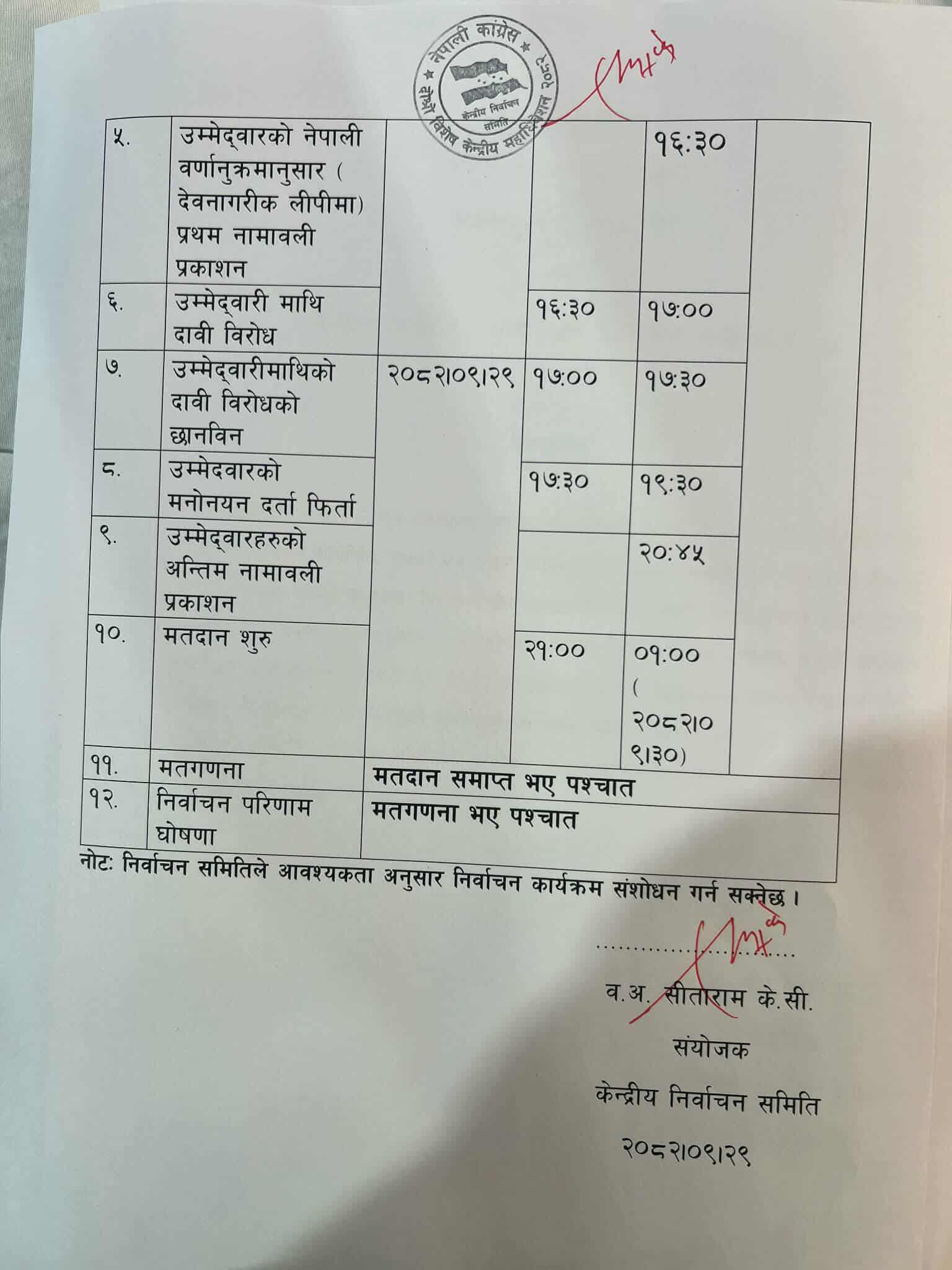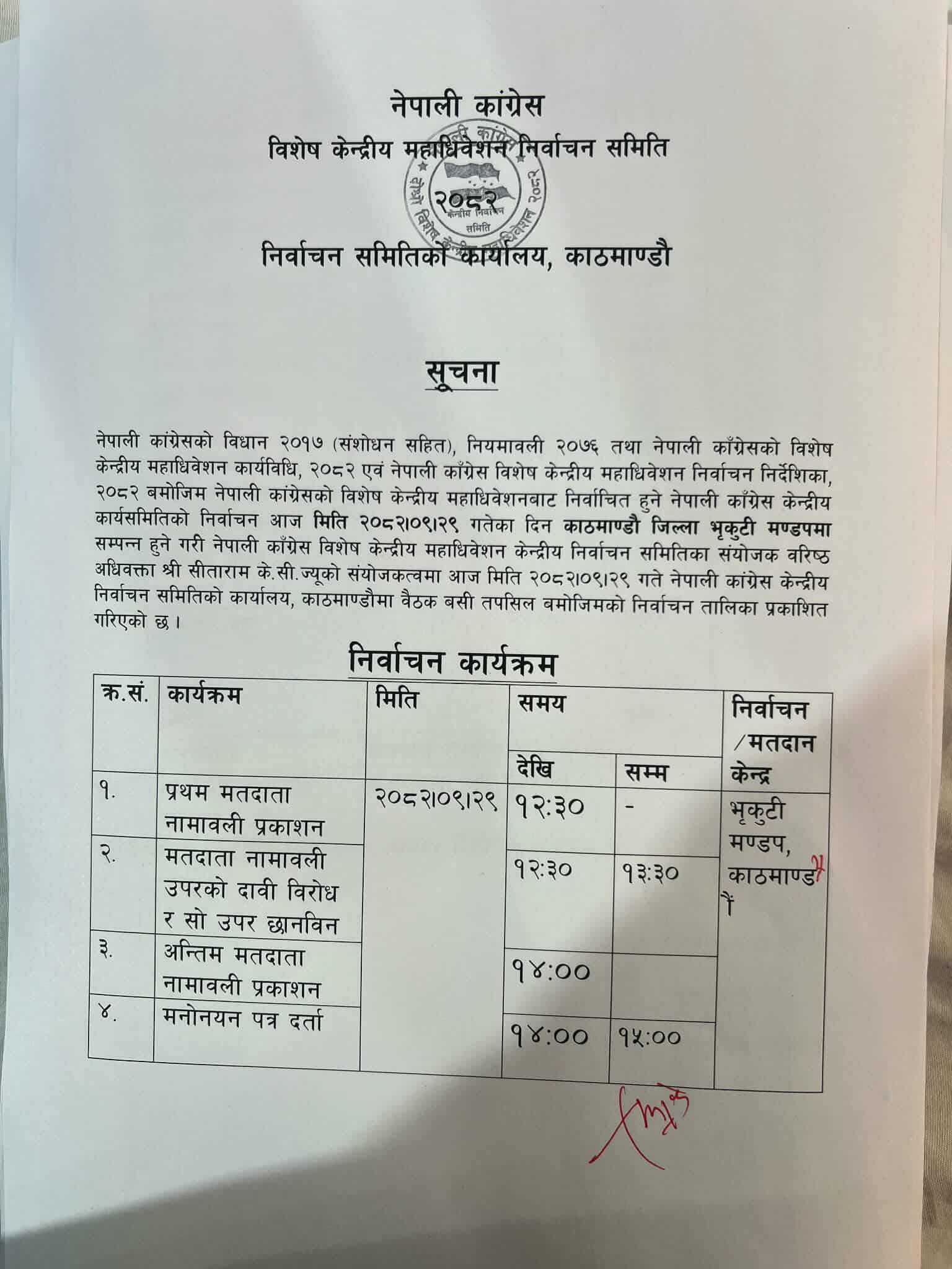 २९ पुस, काठमाडौं । नेपाली कांग्रेसको विशेष महाधिवेशनबाट नयाँ नेतृत्व चयनका लागि कार्यतालिका सार्वजनिक गरिएको छ । निर्वाचन समितिका संयोजक वरिष्ठ अधिवक्ता सीताराम केसीले निर्वाचन कार्यतालिका सार्वजनिक गरेका छन् ।