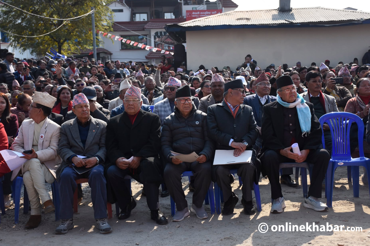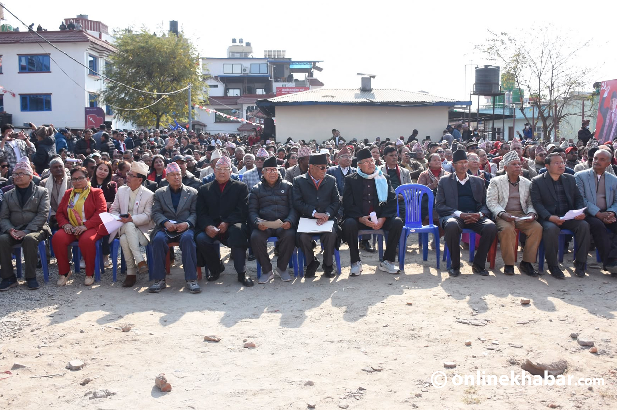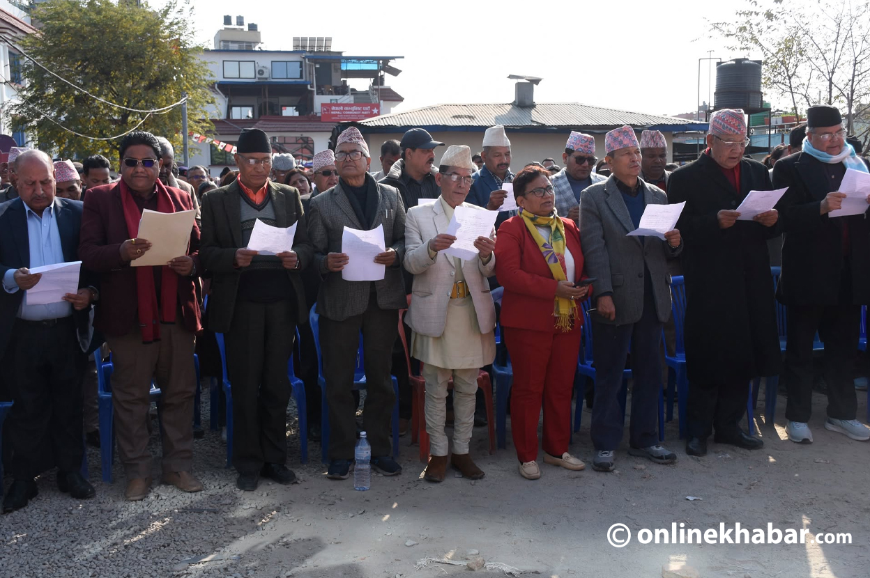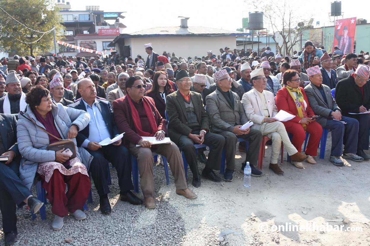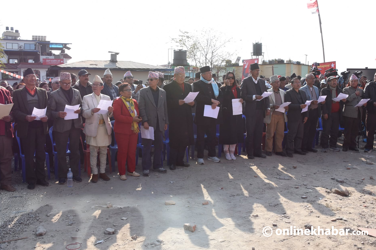 Generated by OK AI. Editorially reviewed.- नेपाली कम्युनिस्ट पार्टी (नेकपा) का २४९९ सदस्यीय केन्द्रीय समितिका सदस्यहरूको शपथ ग्रहण पेरिसडाँडामा जारी छ।