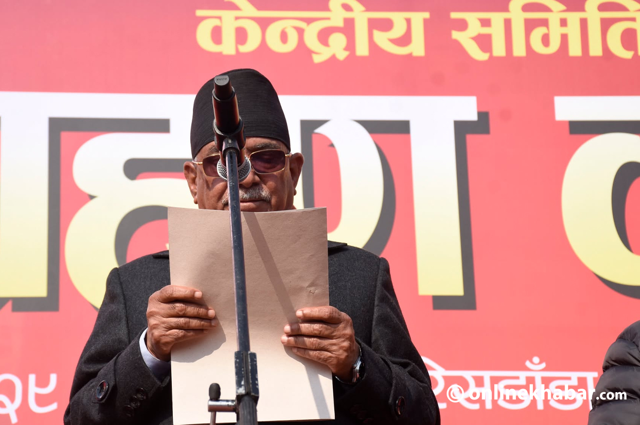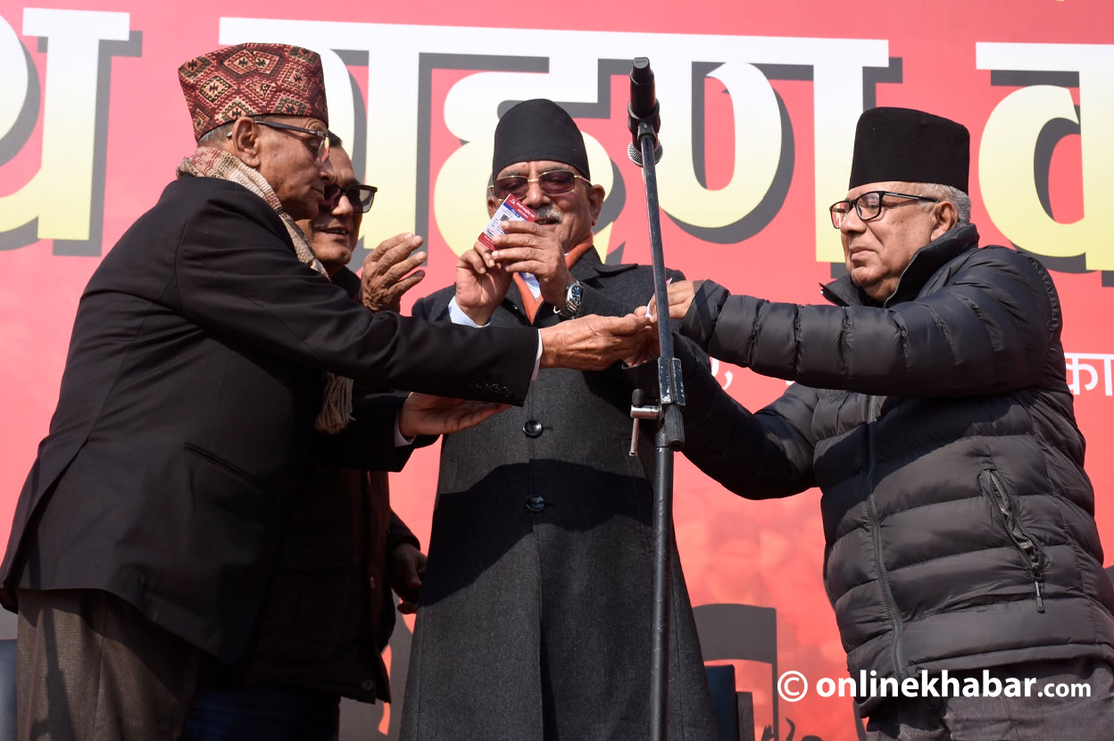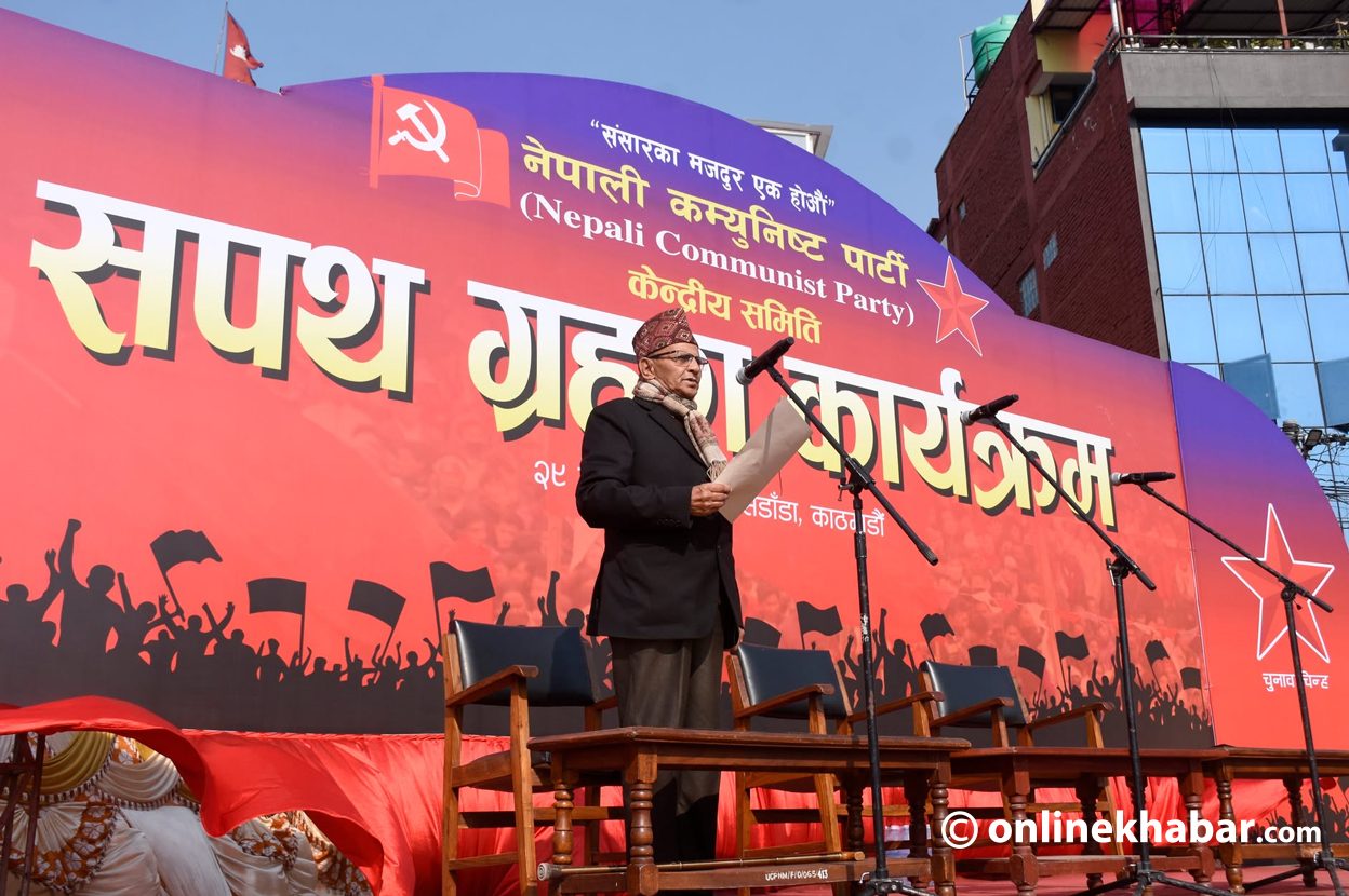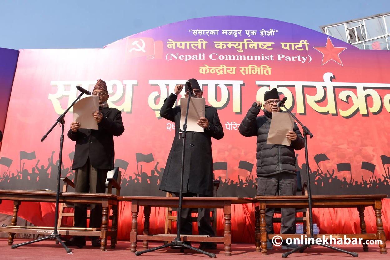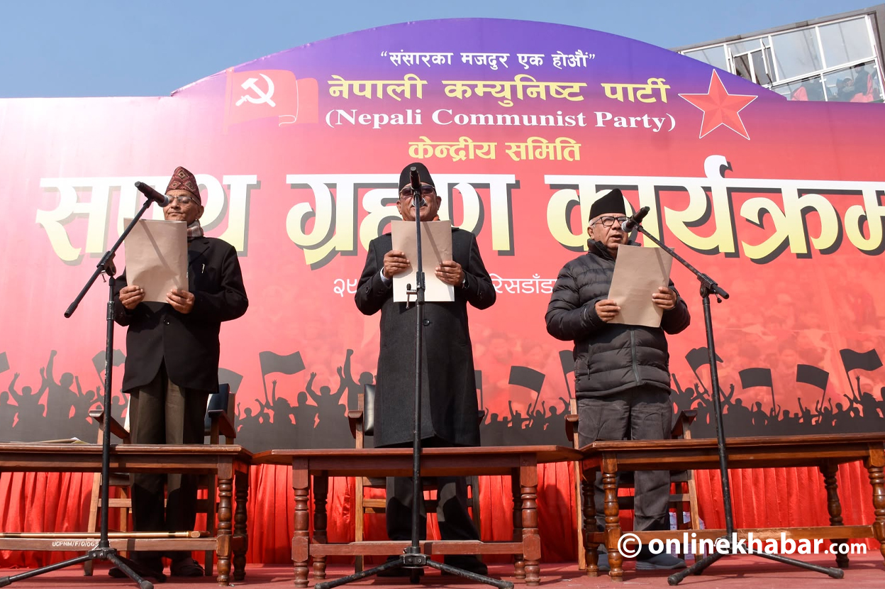 पार्टीका संयोजक पुष्पकमल दाहाल प्रचण्ड, सहसंयोजक माधवकुमार नेपालले जेष्ठ सदस्य नन्दकुमार प्रसाईंसँग शपथ लिइसकेका छन् ।