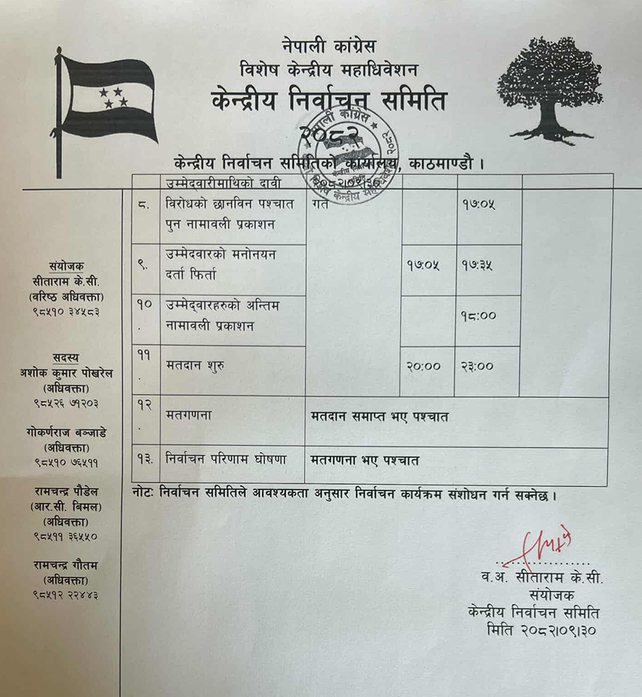 Generated by OK AI. Editorially reviewed.- नेपाली कांग्रेसको विशेष केन्द्रीय महाधिवेशन निर्वाचन समितिले निर्वाचनका संशोधित कार्यतालिका सार्वजनिक गरेको छ।