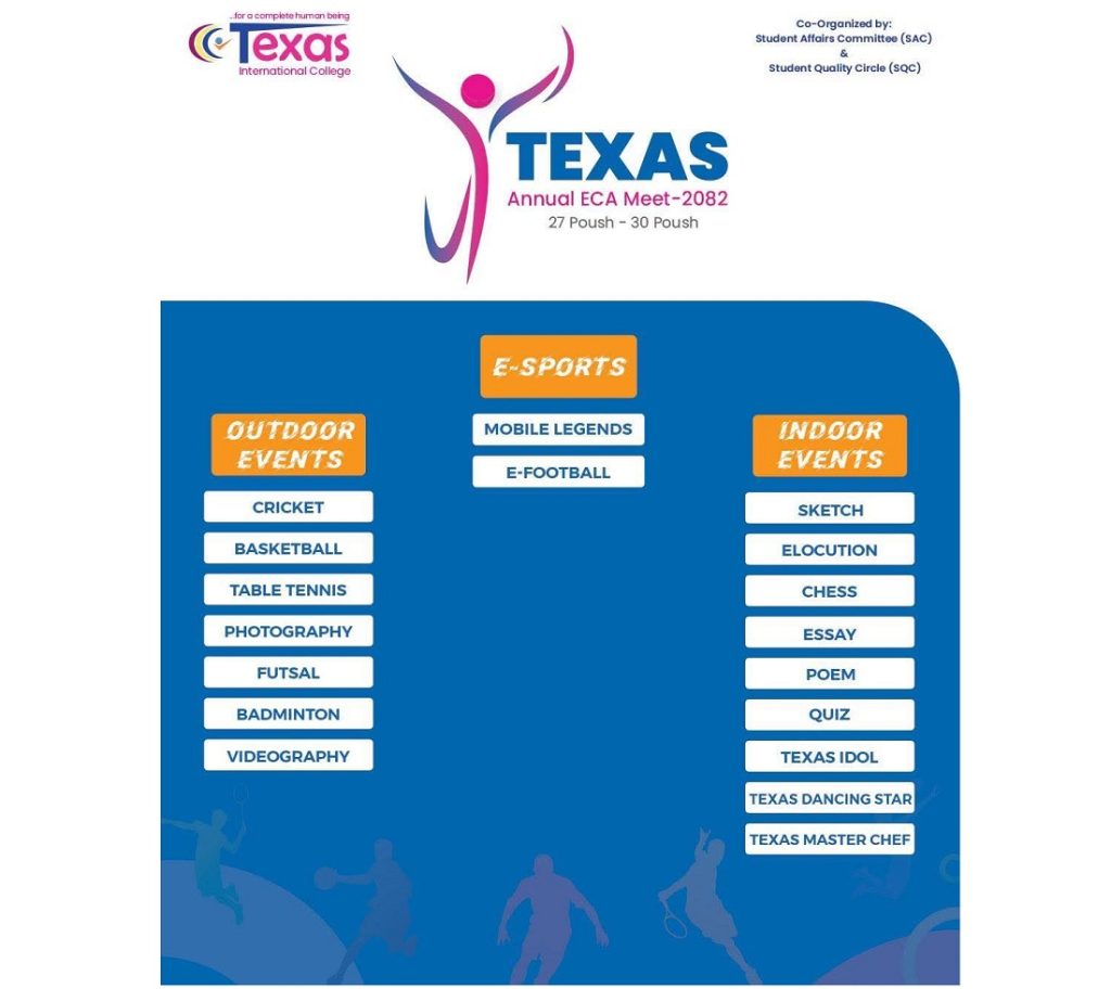 उक्त कार्यक्रममा पुस २७ गतेदेखि ३० गतेसम्म विभिन्न खेलकुद, साहित्यिक तथा सृजनात्मक प्रतियोगिता सञ्चालन गरिएको थियो। समापन कार्यक्रमको अध्यक्षता टेक्सस इन्टरनेसनल एजुकेसन नेटवर्कका कार्यकारी अध्यक्ष भेषराज पोखरेलले गरेका थिए ।