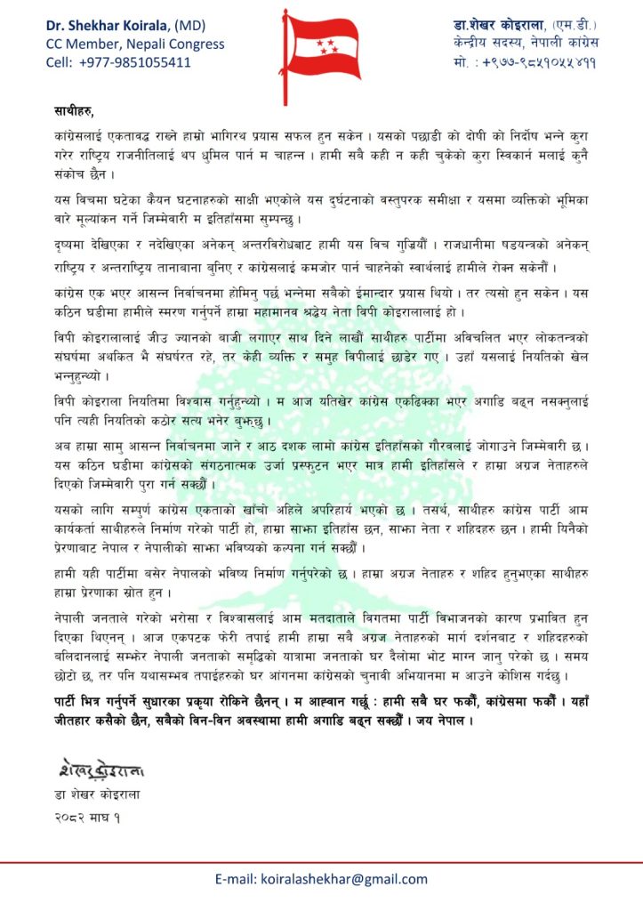 Generated by OK AI. Editorially reviewed.- नेपाली कांग्रेसका नेता डा.शेखर कोइरालाले पार्टी विभाजन रोक्न नसकेको र कांग्रेसलाई एकताबद्ध राख्ने प्रयास सफल नभएको बताएका छन्।