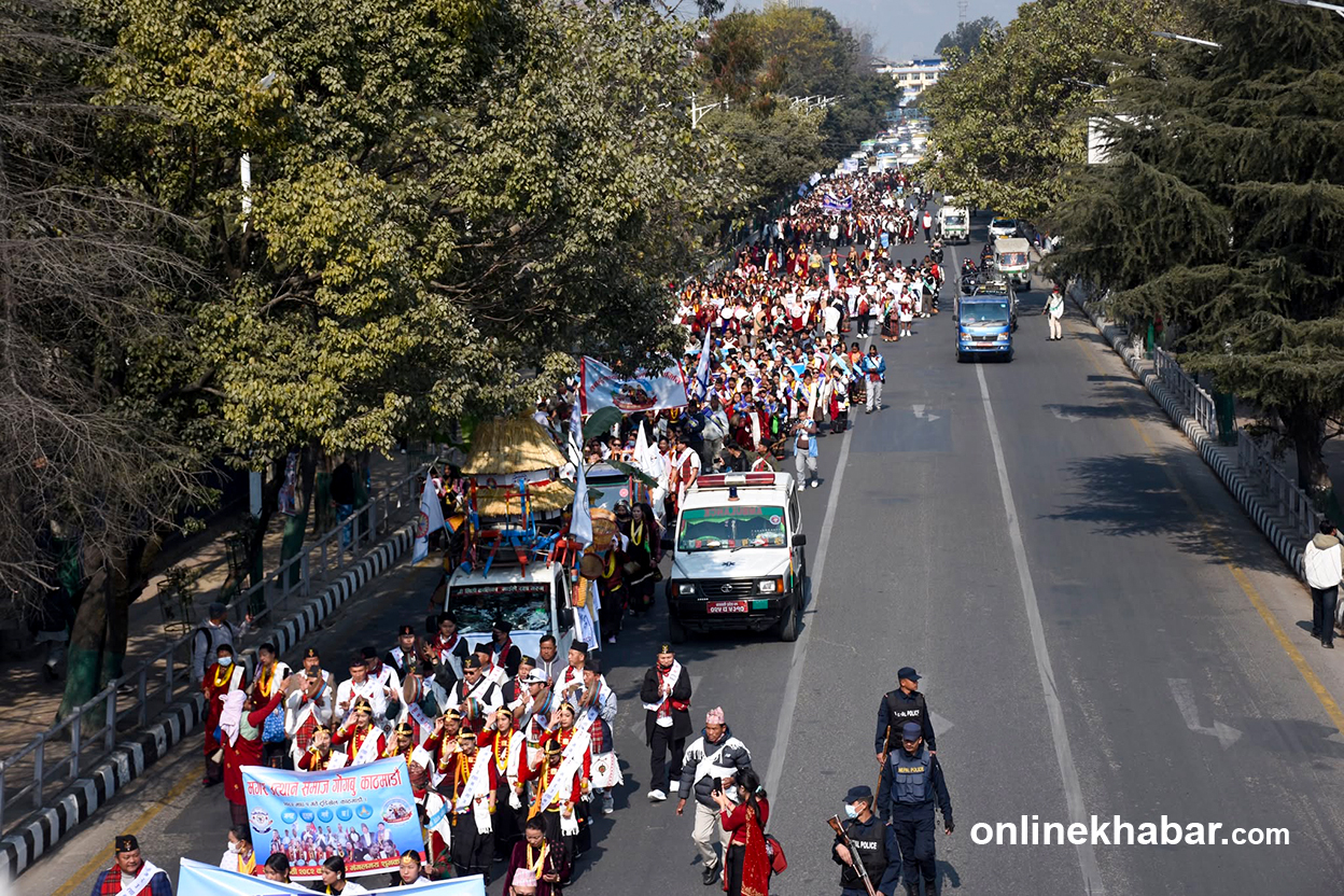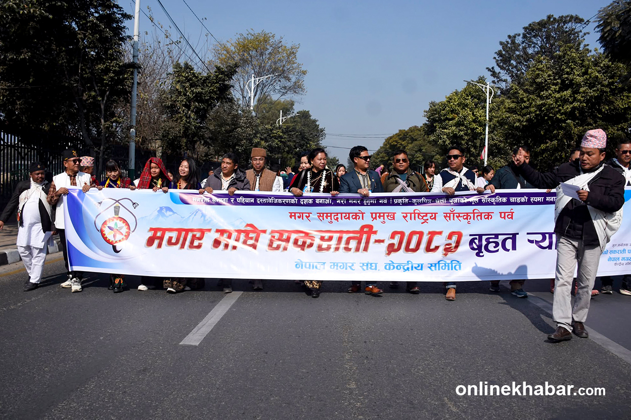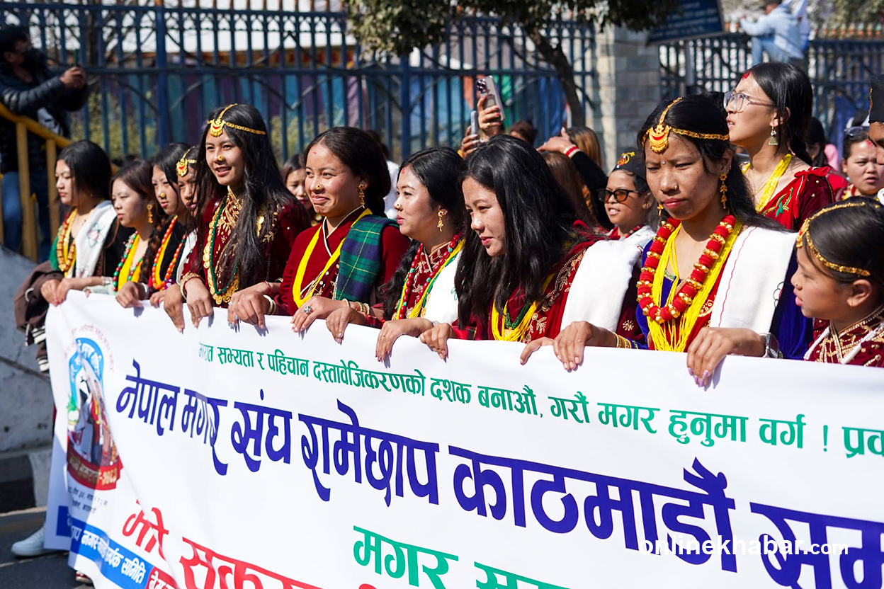 नेपाल मगर संघ केन्द्रीय समितिको आयोजना र विभिन्न संघसंस्थाको अगुवाइमा काठमाडौंमा उपत्यकामा बस्दै आएका मगरहरूले बिहीबार भृकुटीमण्डपबाट टुँडिखेलसम्म सांस्कृतिक र्याली निकालेका हुन् ।