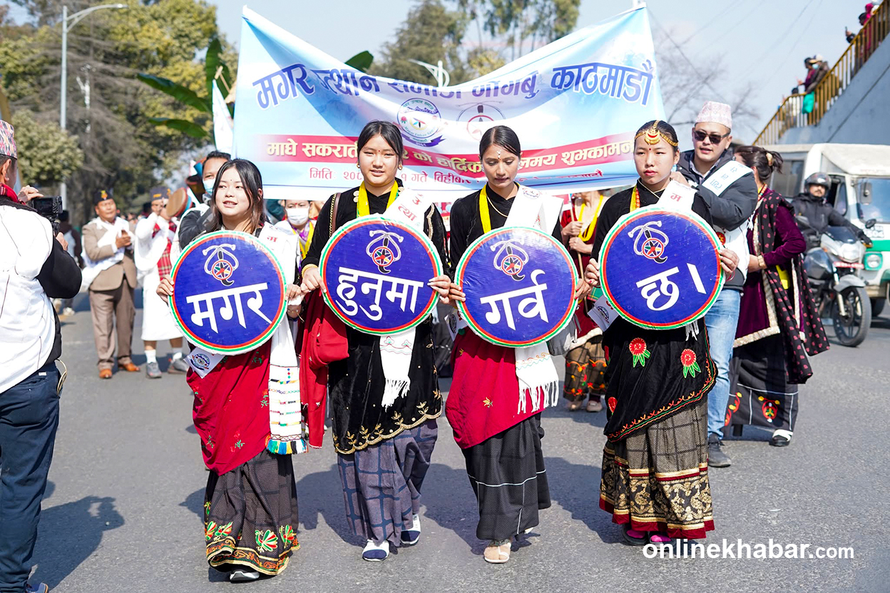 १ माघ, काठमाडौं । माघे सङ्क्रान्ति पर्वका अवसरमा काठमाडौंमा बसोबास गर्दै आएका मगरहरूले सांस्कृतिक र्याली निकालेका छन् ।