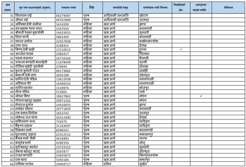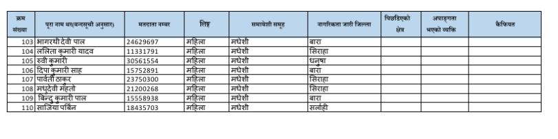 खसआर्य महिलामा संगिता सिलवाल, मुस्लिम महिलामा बेनजिरा खातुन, दलित महिलामा संगिता नेपाली, थारु महिलामा निराशा कुमारी चौधरी, थारु पुरुषमा अमलेश राना रहेका छन् ।