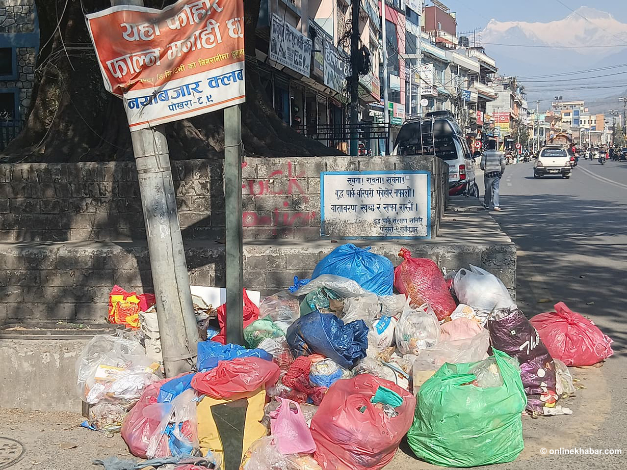 तर, जहाँ सूचनाको ब्यानर टाँगिएको छ, त्यसको ठिक अगाडि फोहोरको डंगुर छ । पैदल यात्रुहरू नाक थुनेर हिँडिरहेका छन् । यो दृश्यले पोखरालाई गिज्याइरहेझैं लाग्छ ।