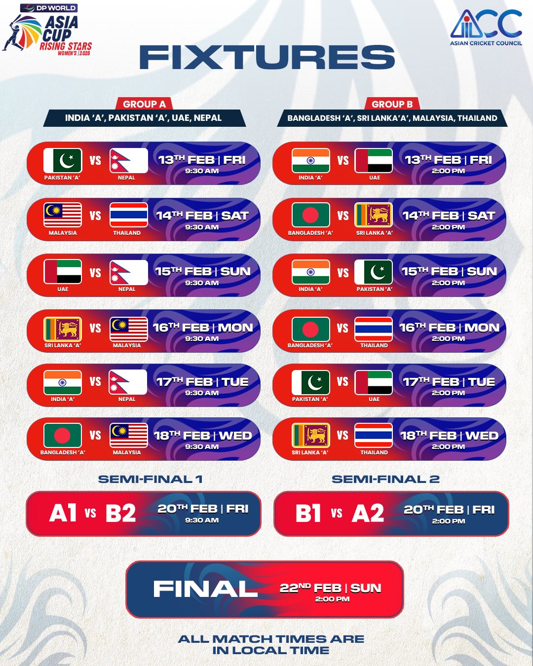 - दुवै समूहबाट शीर्ष २ टोली सेमिफाइनलमा पुग्नेछन् र नेपालले १५ फेब्रुअरीमा यूएई र १७ फेब्रुअरीमा भारत 'ए' सँग खेल्नेछ।