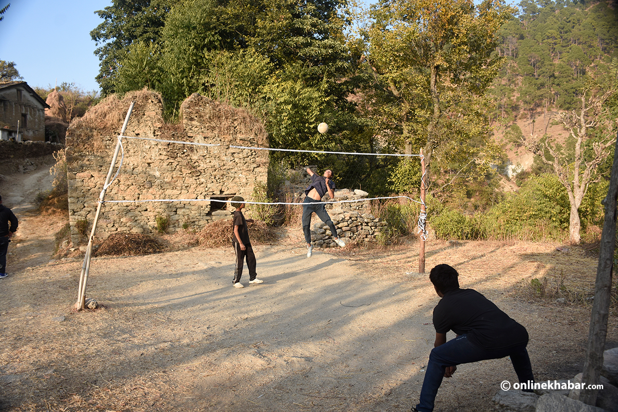 नजिकैको बारीमा केटाकेटीहरुले पोल गाडेर भलिबल खेल्ने ठाउँ बनाएका छन् । छेवैमा शेरबहादुरका भाइभतिजा र नातेदारहरुका घर खुला अवस्थामा छन् । घरबारी हेरिदिने कोही छैन, बस्तीमा केही छैन । त्यत्ति हो, नाङ्गो आकाश र बाँझो बारी एकअर्कासँग आमनेसामने छन् ।